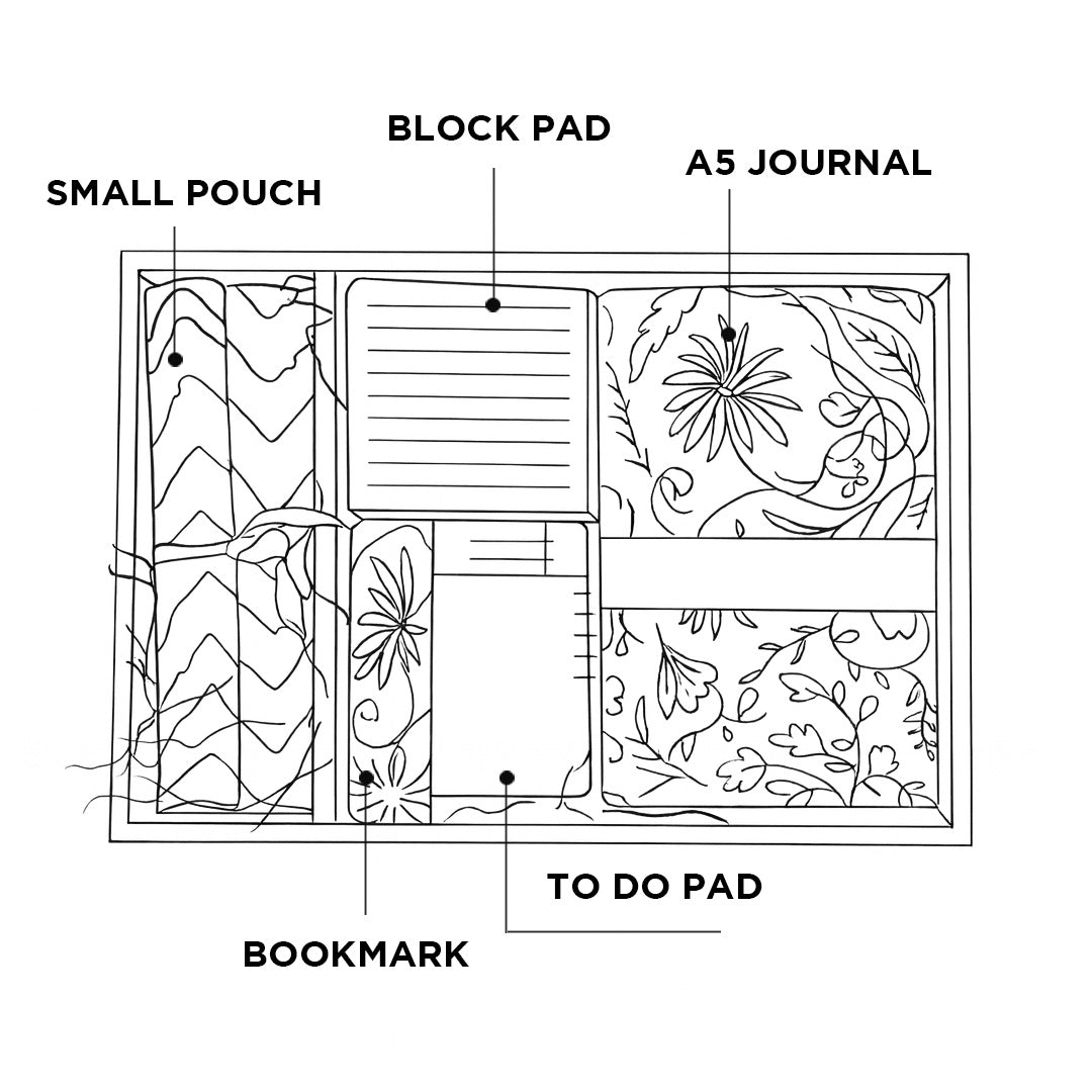 - It includes a premium A5 notebook, a matching bookmark, a handy to-do list notepad, and a spacious fabric pen case, all crafted from sustainable materials to reduce environmental impact.