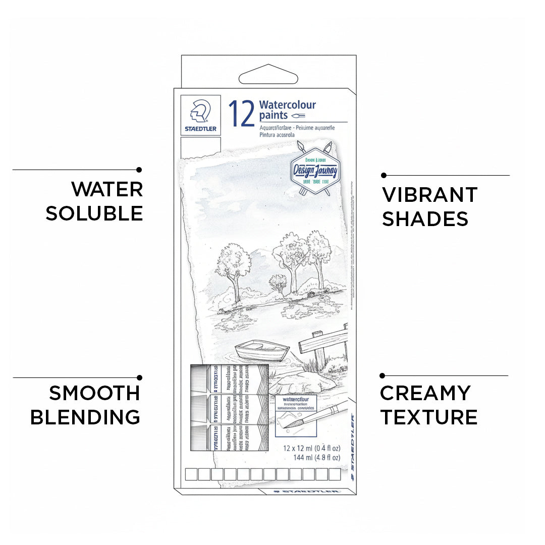 - Staedtler design journey water colour paint tubes set features assorted vibrant colours packed in durable plastic tubes for easy use and clean storage.