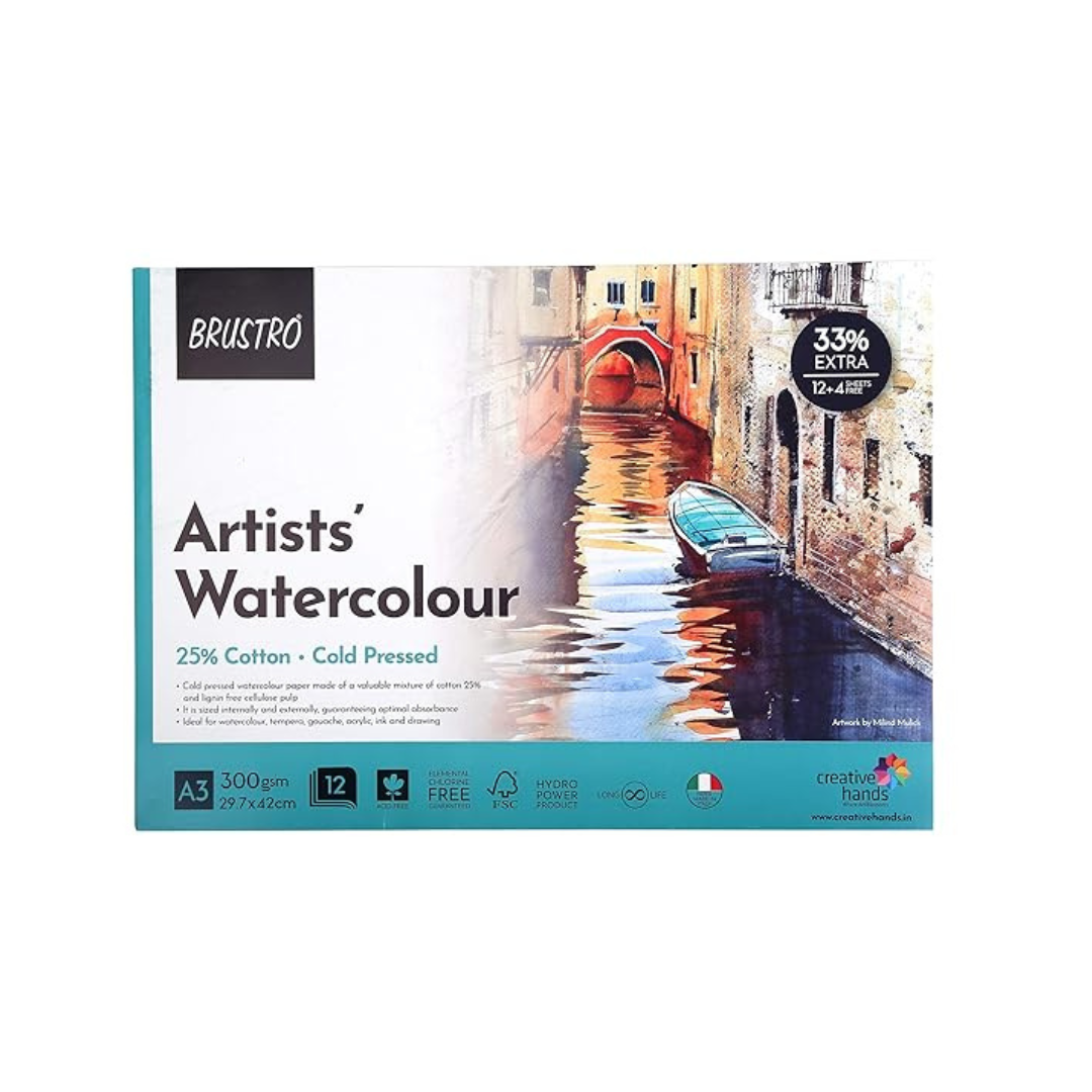 - 25% cotton 300 gsm cold pressed , Size - A3 Glued Pad , 12 + 4 Free Sheets , Pad glued on one side .