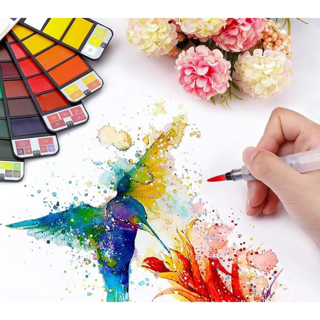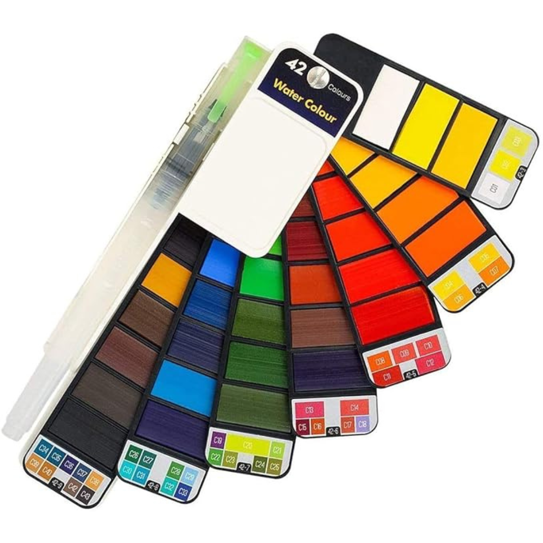 - Not only do all sets include colour cards and an integrated watercolour mixing palette, we'll also give you one Brustro Aqua Squeeze brush pen. Colours are fade-proof, pigment rich and easy to blend to create an endless range of colours to satisfy both the beginner and seasoned artist. Try these sets once and you'll never go back to a traditional set again, especially if you enjoy plein air painting or want to take your watercolours with you when travelling. Once the trays are empty, refill them with watercolour tubes and re-use them.