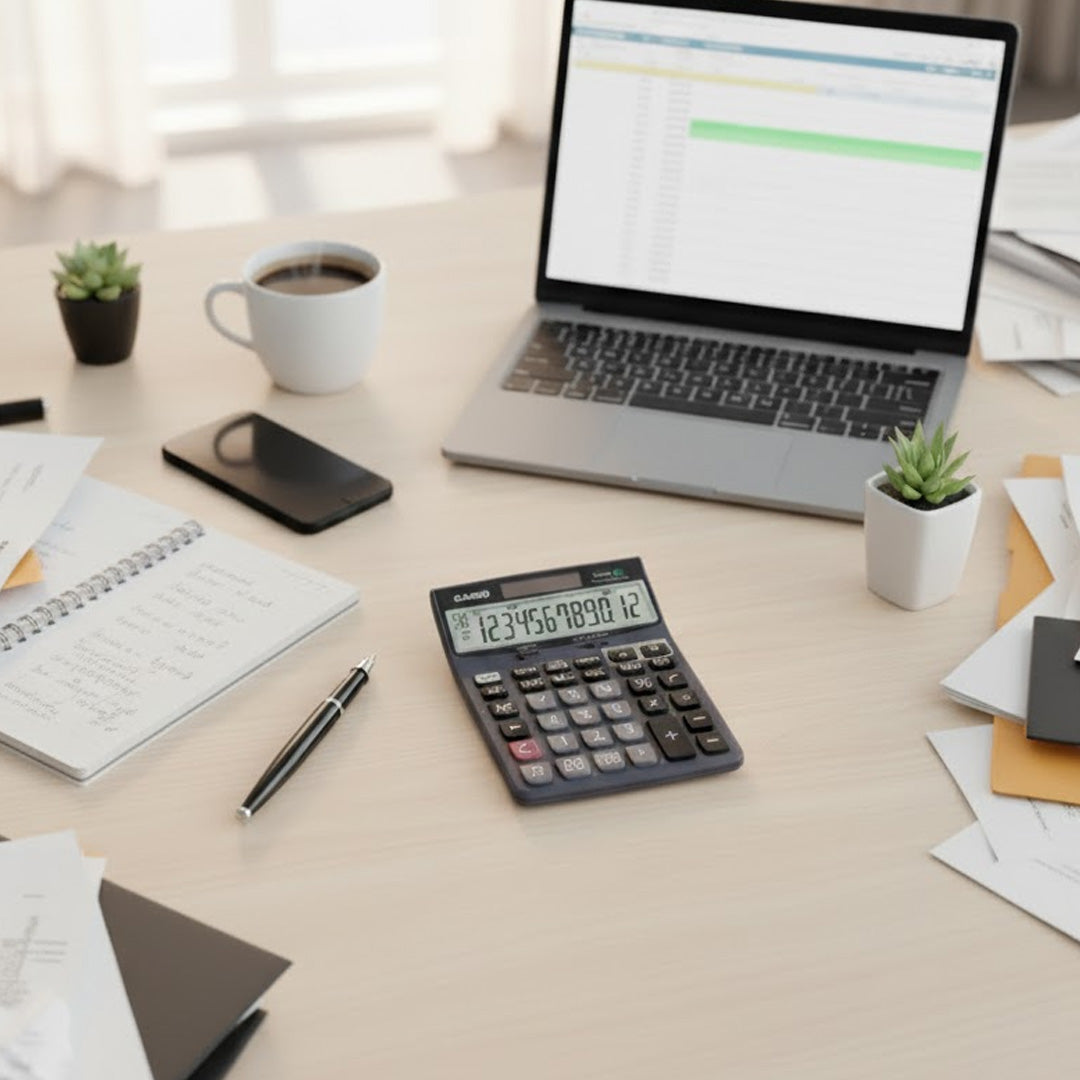 - Black-coloured calculator , designed and engineered for easy operation.