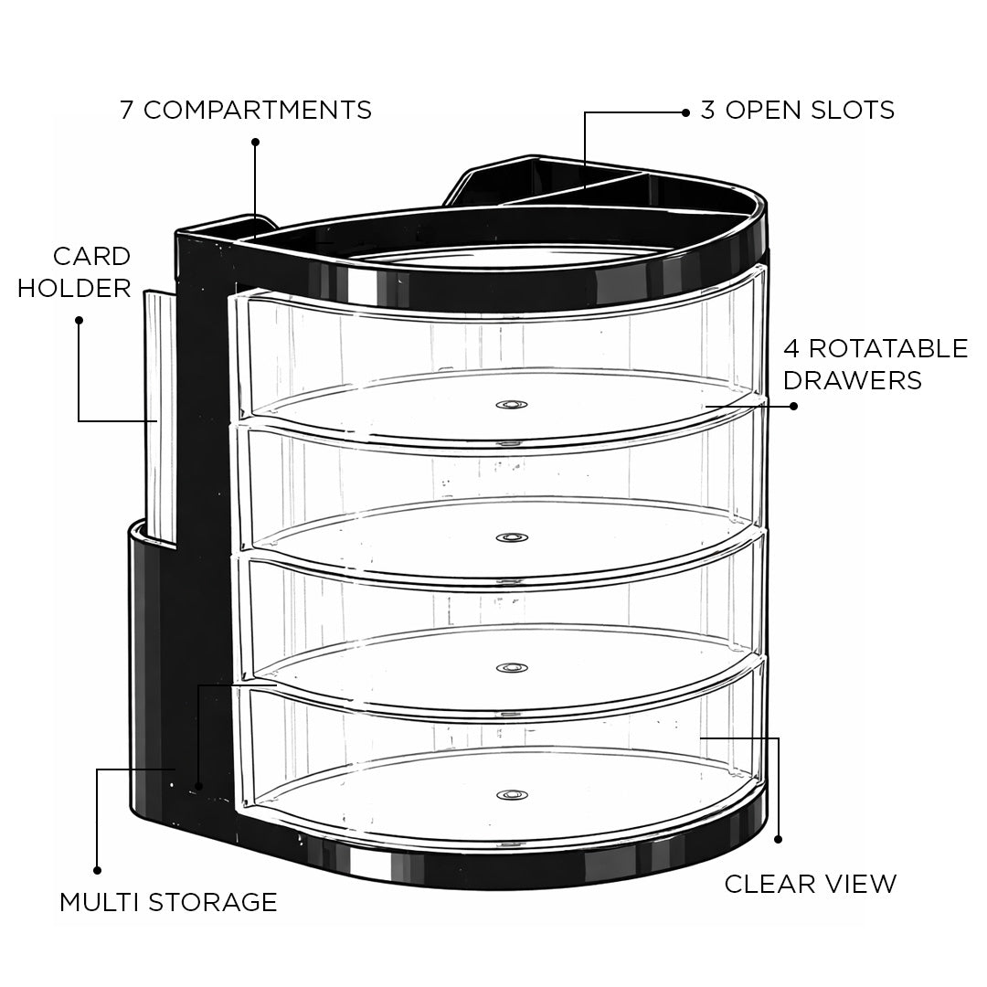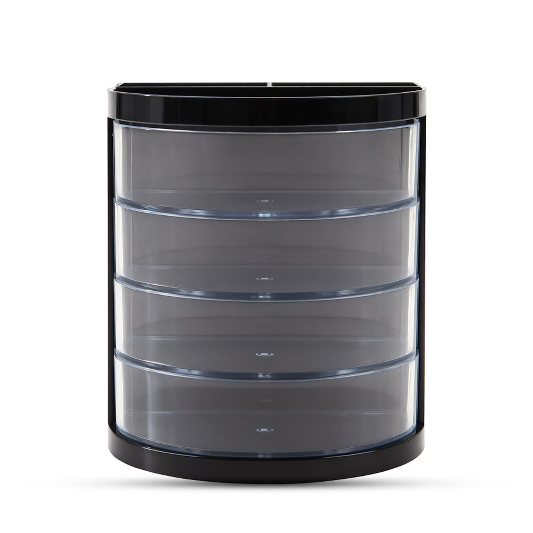 - Made from high-quality, durable plastic, this black desk organizer features three open compartments and four pull-out drawers, providing ample storage space for a wide range of office supplies, stationery, and small essentials.