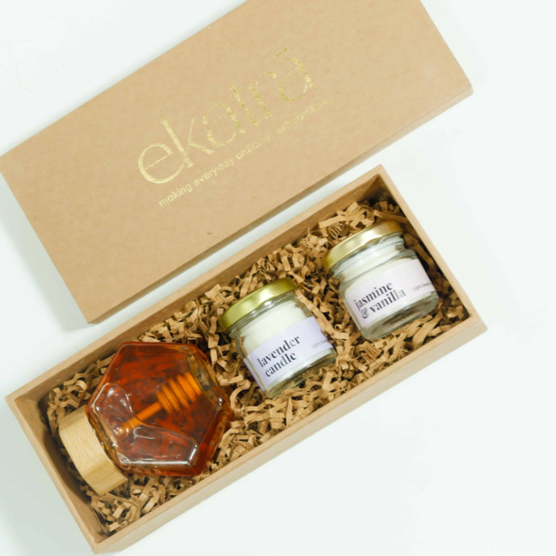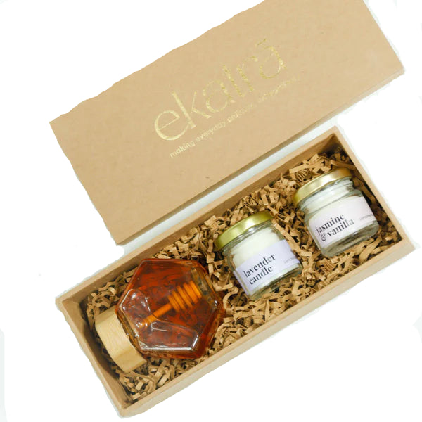 - The Amber Evenings – 2 set by Ekatra is a thoughtfully curated hamper that blends elegance, warmth, and functionality.