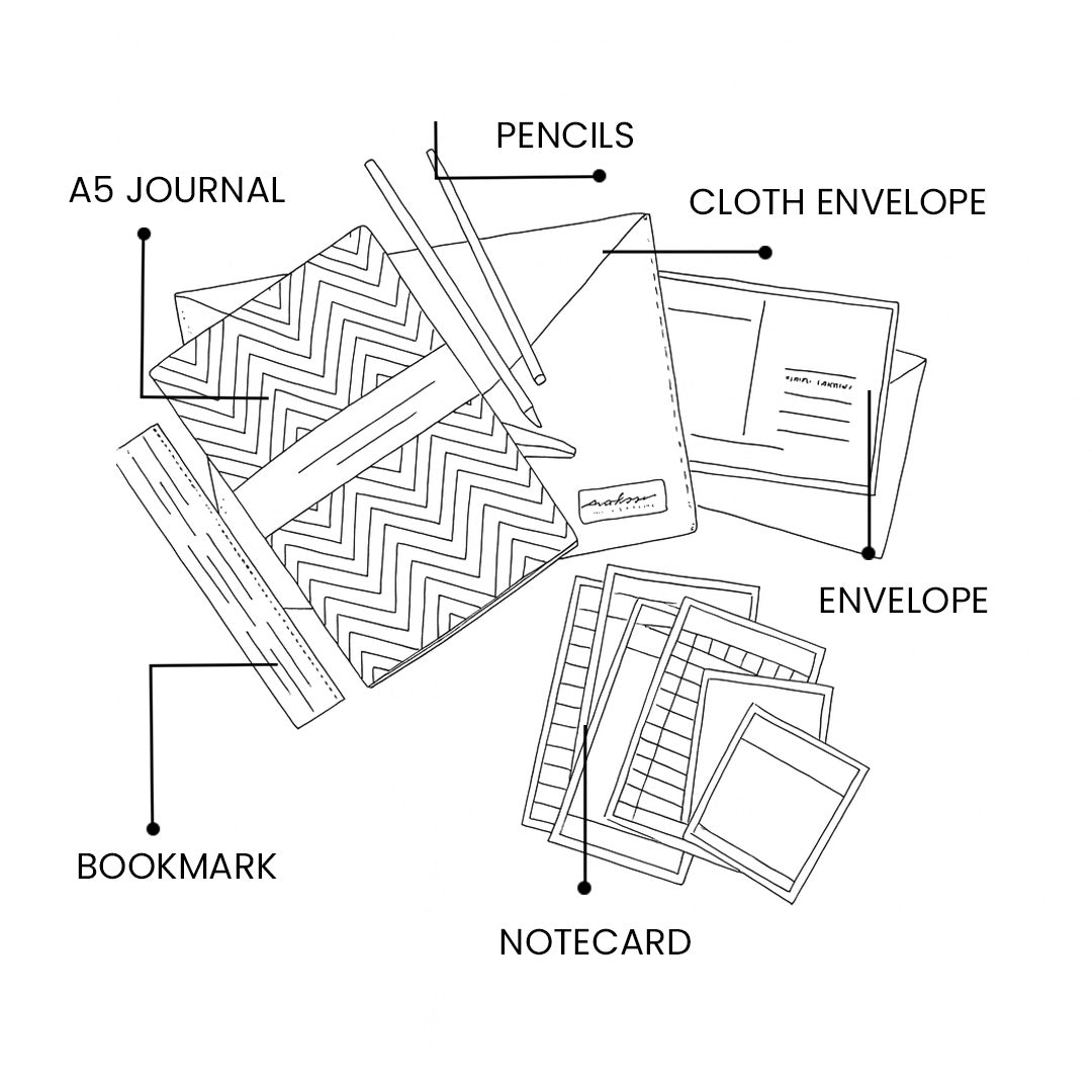 - Created to bring joy through small yet meaningful essentials, this hamper features a mix of handcrafted stationery, fabric accessories, and everyday lifestyle items.