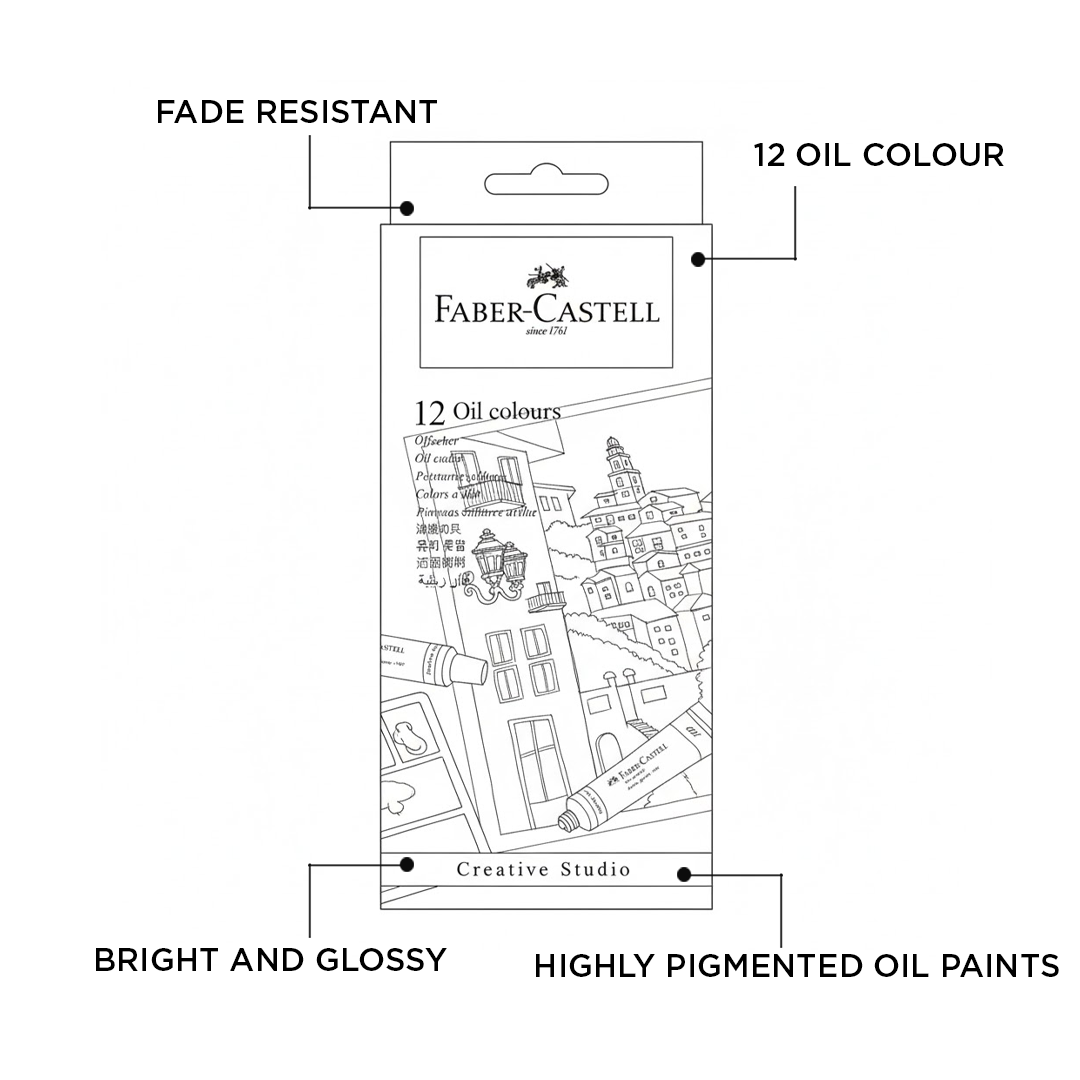 - The Faber-Castell Oil Colours Pack of 12 (12 ml tubes) is a versatile set of vibrant oil paints ideal for beginners, students, and hobby artists.