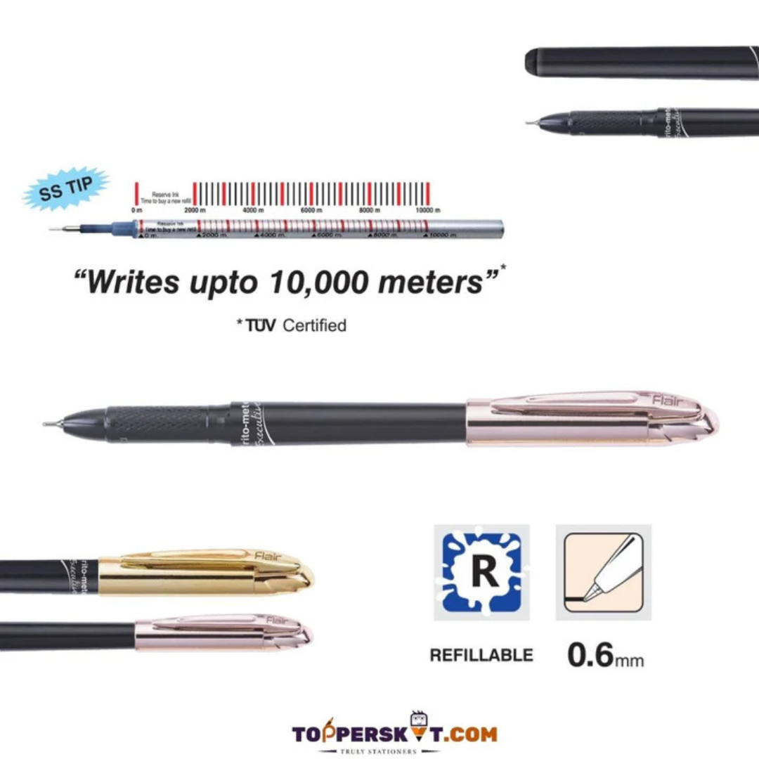 - Elevate your writing with the Flair Writo-Meter Executive Ball Pen in blue. With a 0.6mm tip and the ability to write up to 10,000 meters, this refillable pen offers unmatched longevity and precision.