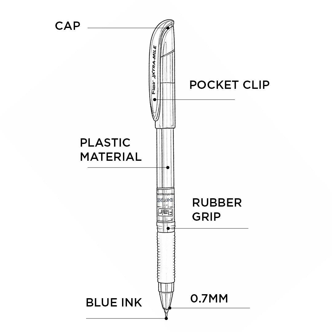 - Filled with smooth blue ink, the flair xtra-mile ball Pen delivers clean, consistent lines with minimal pressure, ensuring neat and effortless writing without skipping.