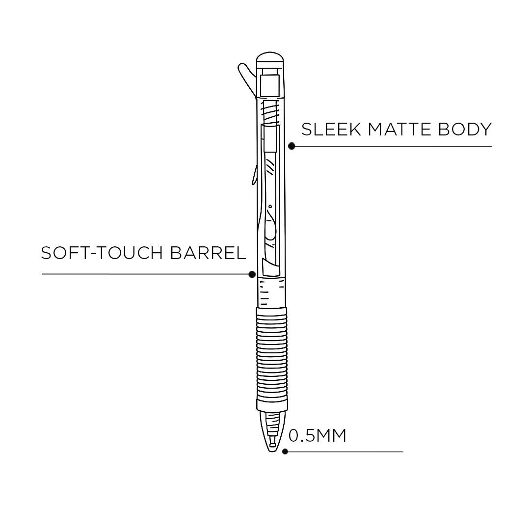 - Its soft-touch barrel provides a comfortable grip for long writing sessions, while the retractable mechanism keeps it practical and mess-free.