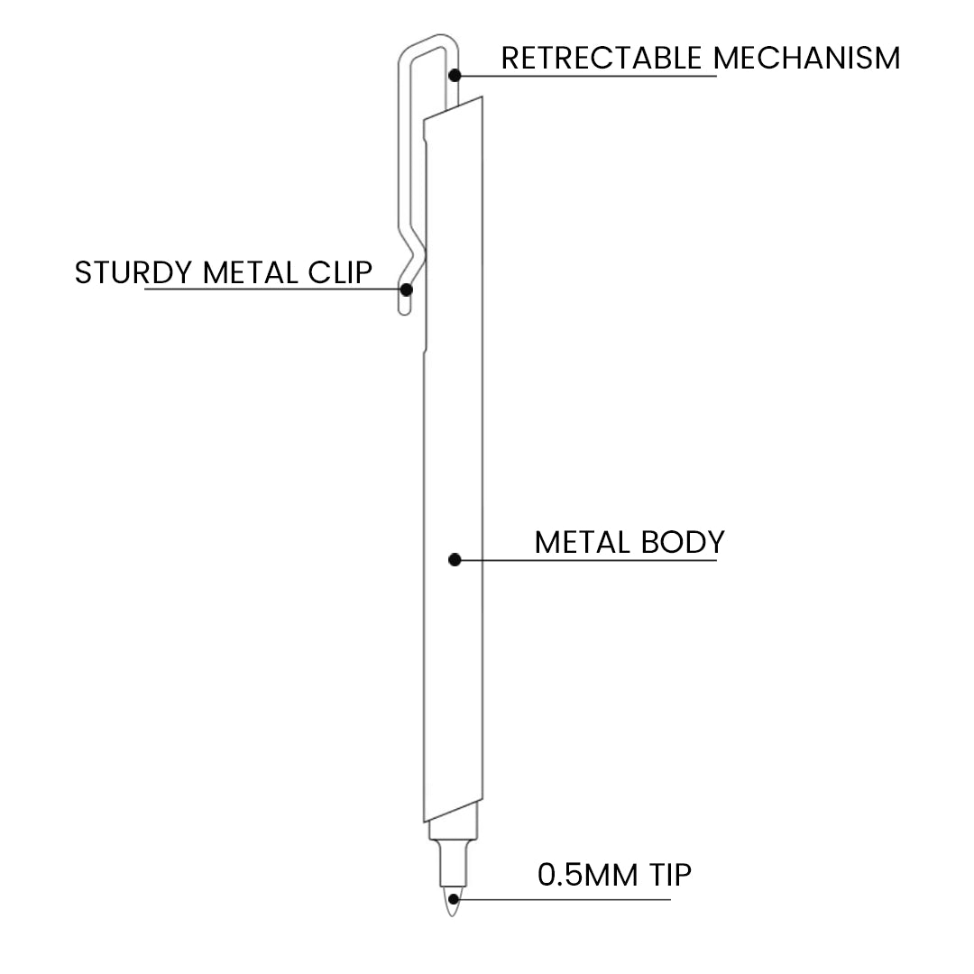 - Sleek Metal Design: The Klip Gel Pen boasts a sophisticated metal body that combines style with durability.