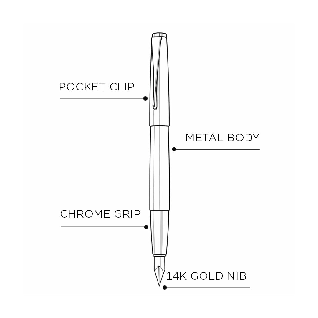 - It has a propeller shaped bright chrome metal clip and a smooth interchangeable two-tone 14k gold nib.