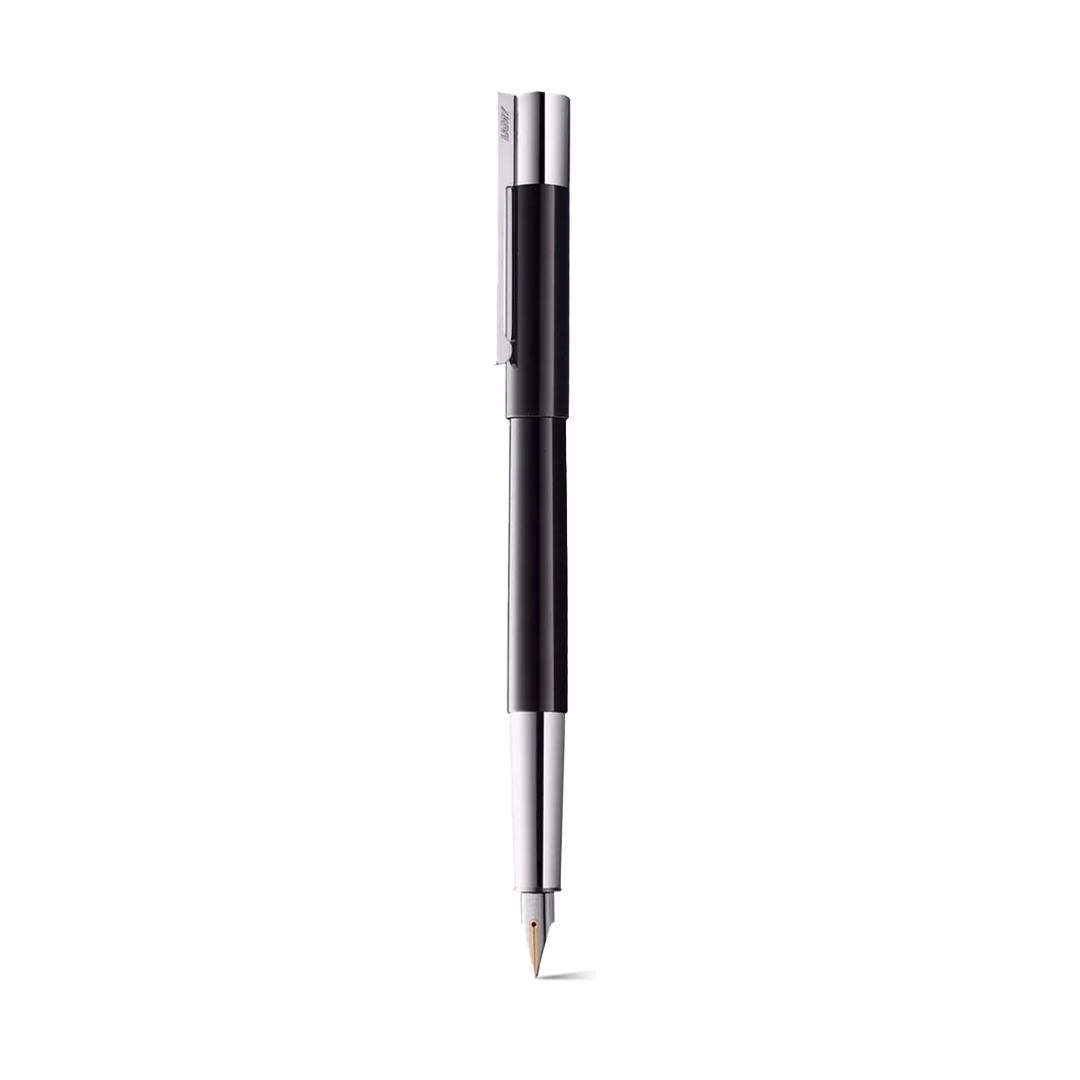 - This Lamy Scala fountain pen in Piano Black features a body and cap of black glossy lacquer over stainless steel accented by shiny chrome grip section, trim and clip, with a bi-color 14k gold nib.