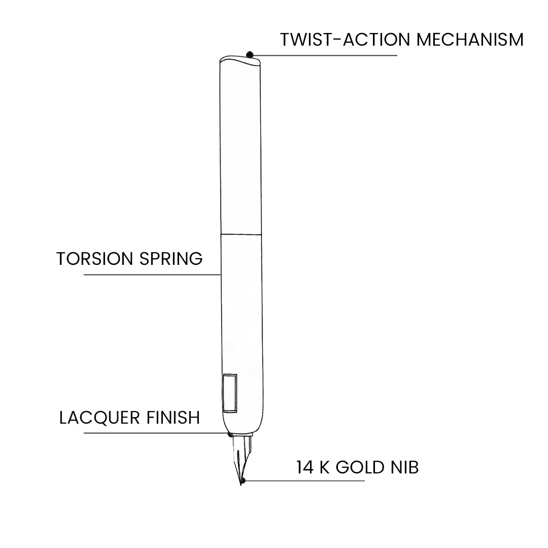 - The 14kt gold nib elegantly slides out of the inside of the case by means of a worldwide unique turning mechanism. When the mechanism is closed, a ball valve automatically slides in front of the opening and protects the nib from drying out.