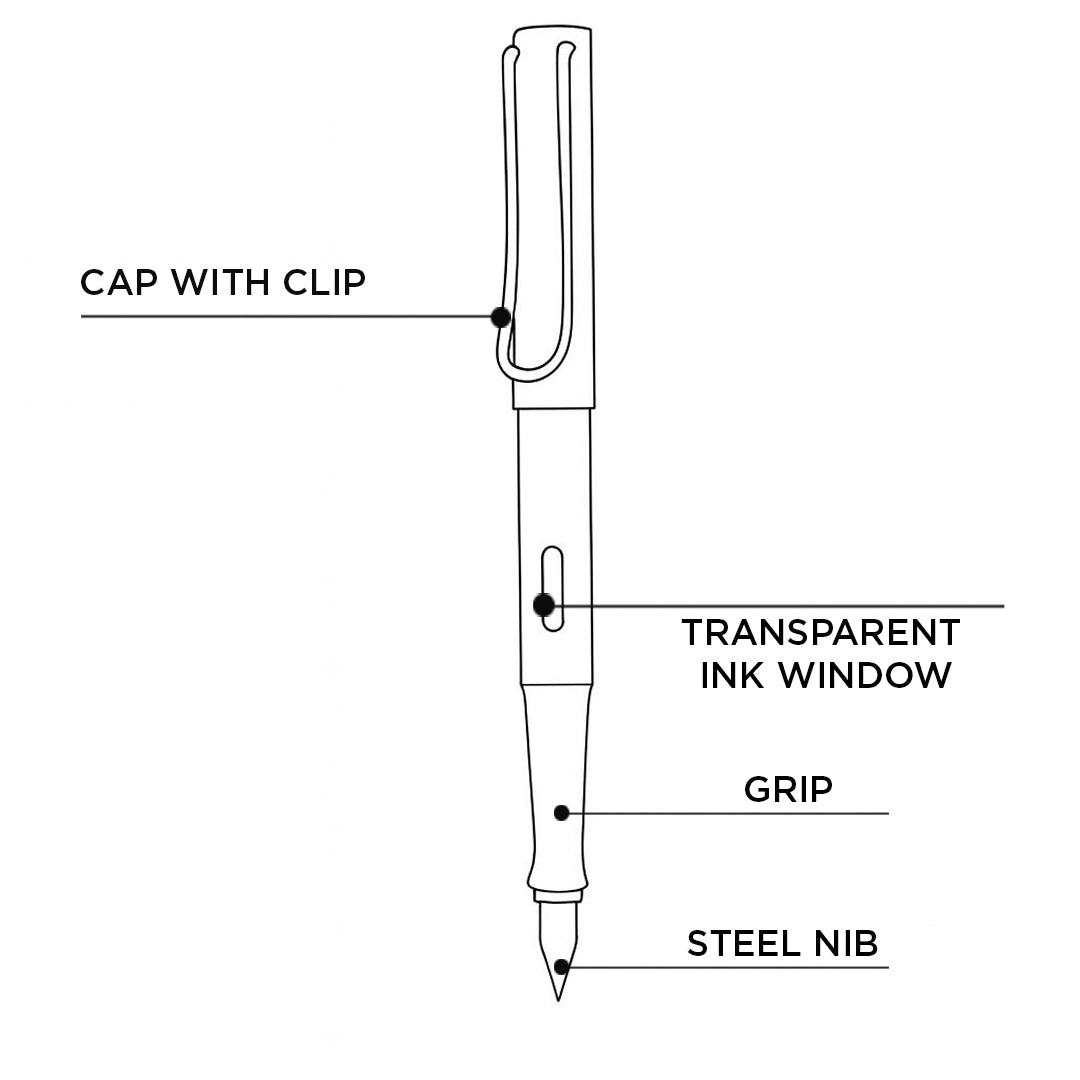 - Each fountain pen comes with an interchangeable black steel nib, which can be easily swapped out for another size. It also comes with a blue LAMY ink cartridge so you can get started writing right away.