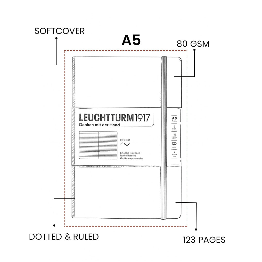 - The Leuchtturm1917 Softcover A5 Dotted Notebook combines flexibility and style for note-taking, journaling, or creative planning.