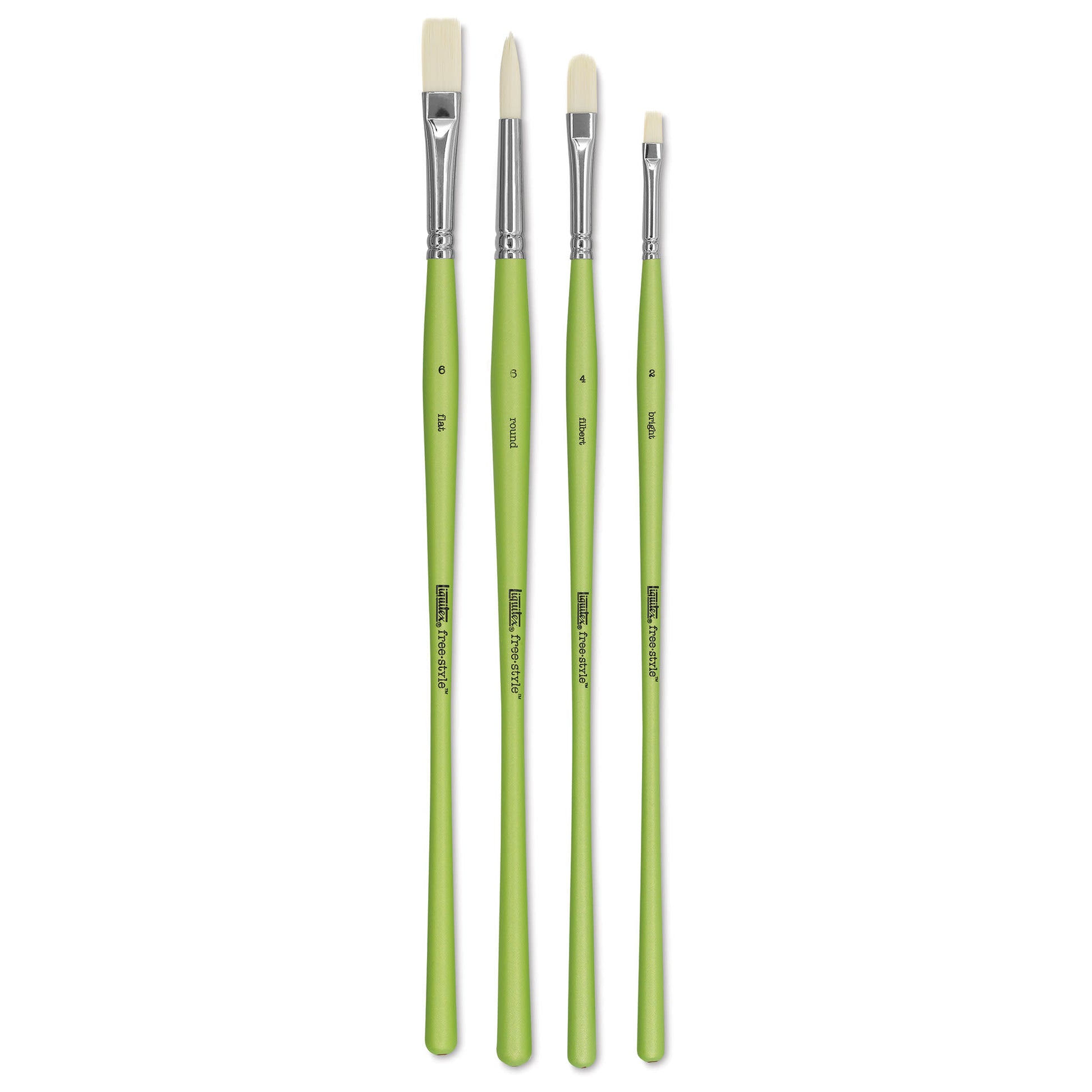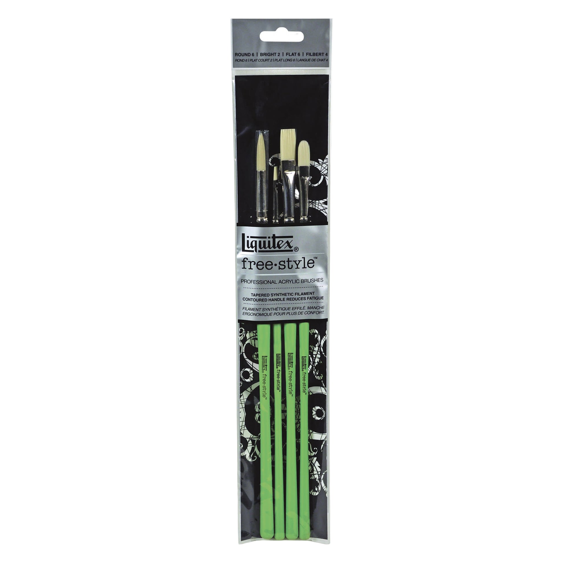 - The Liquitex Freestyle Brush Set – Pack of 4 is designed for artists who love to work on a large scale with expressive techniques.