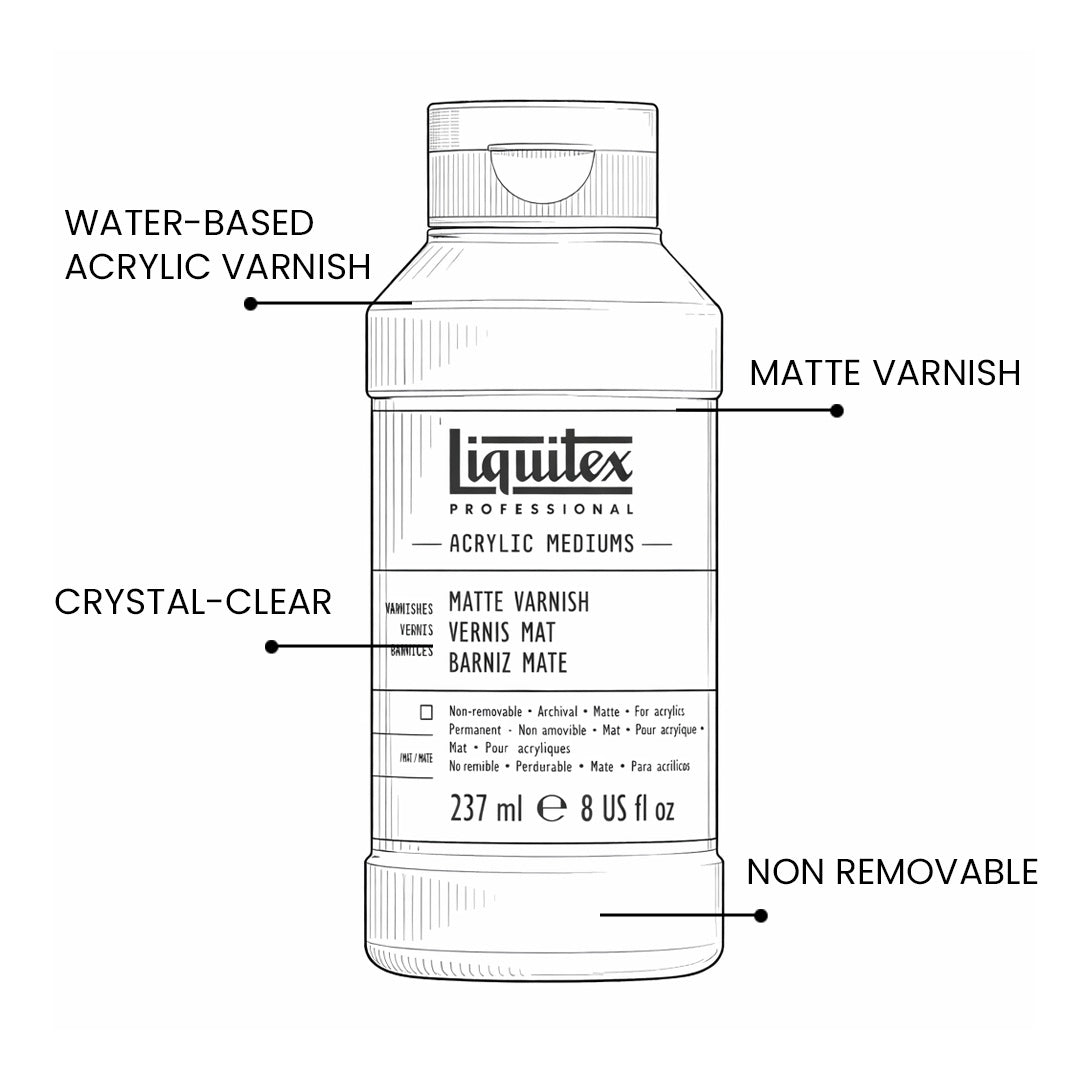 - Liquitex Professional Matte Varnish is a high-quality, non-yellowing acrylic varnish designed to protect and preserve your artwork while reducing surface shine.