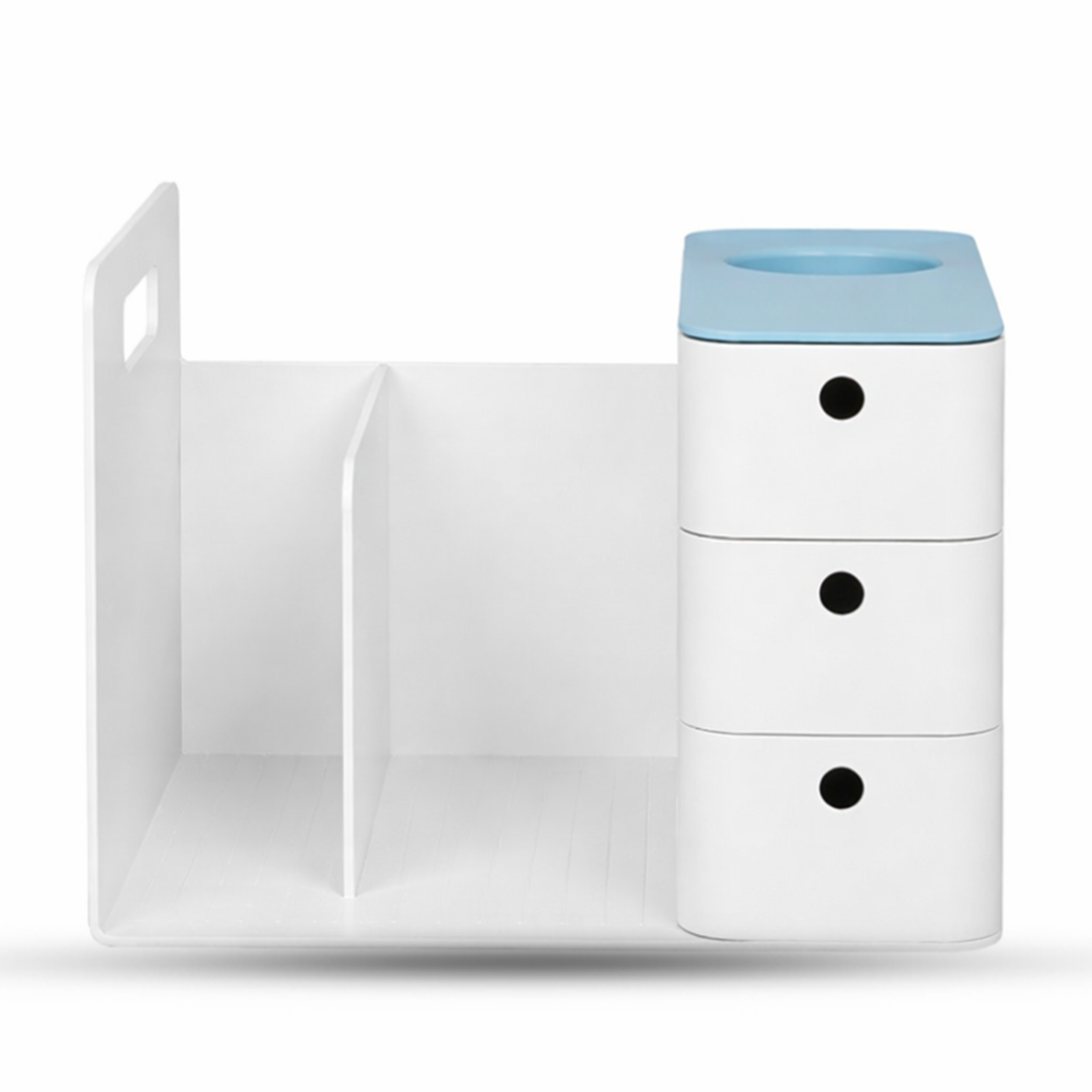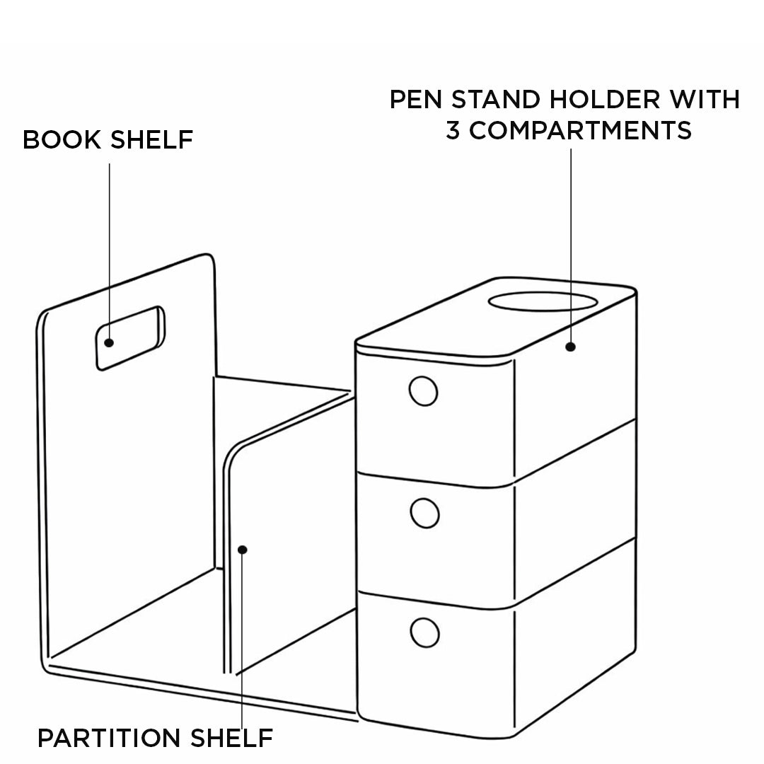 - Made from durable plastic, this multi-compartment organizer combines a bookrack with a built-in pen stand, providing a neat and accessible storage solution for your desk, office, or study area.