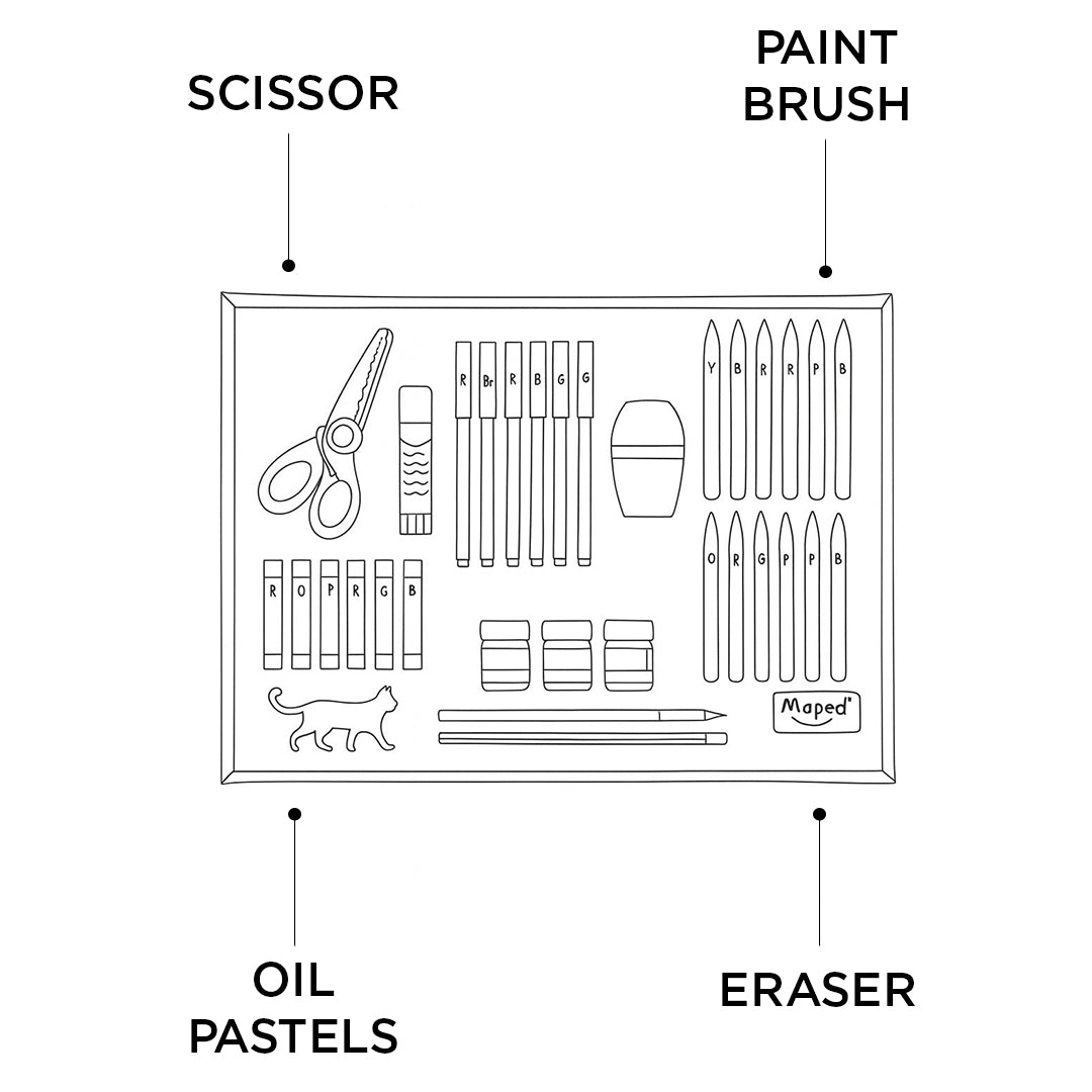 - This super exciting fun kit includes : - Brush x1, Felt tip pens x6, Pencil Sharpener x1, Glue stickx1, Eraser x1, Poster Colors x3, Pencil x1, Plastic Crayons x12, Scissor x1, Oil Pastels x6, Scrapper x1 and Art cards x5.