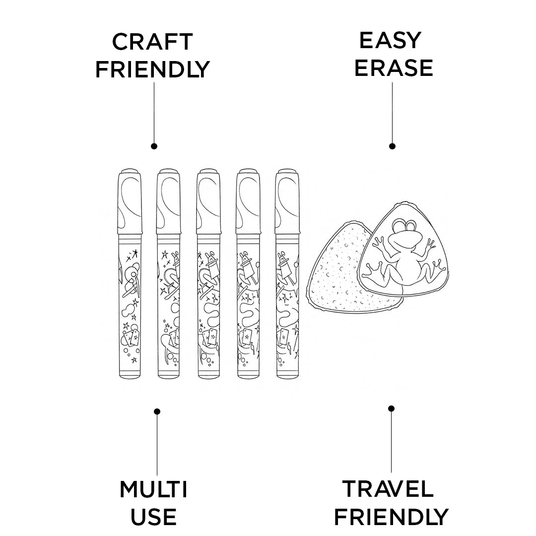 - An innovative markers kit that writes and rubs off almost everywhere. 6 multi-surface erasable markers and 1 sponge.