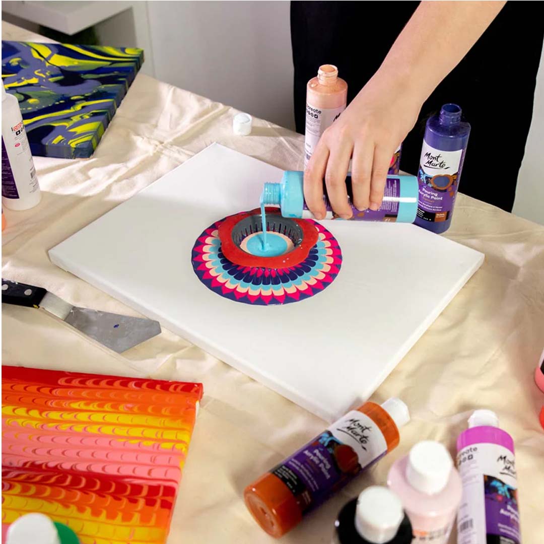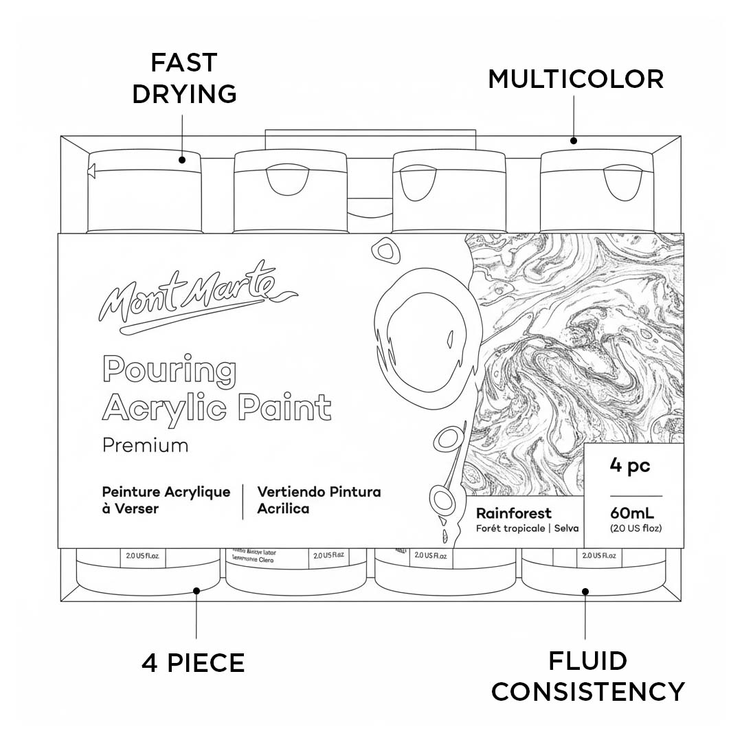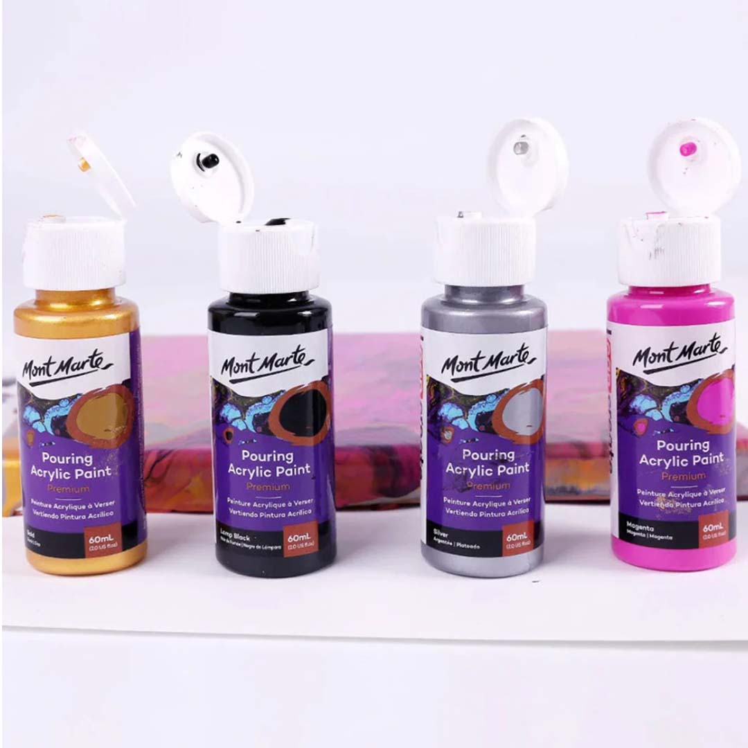 - The Mont Marte Pouring Acrylic Premium Paint Set is specially formulated for artists and hobbyists who love fluid art and acrylic pouring techniques.