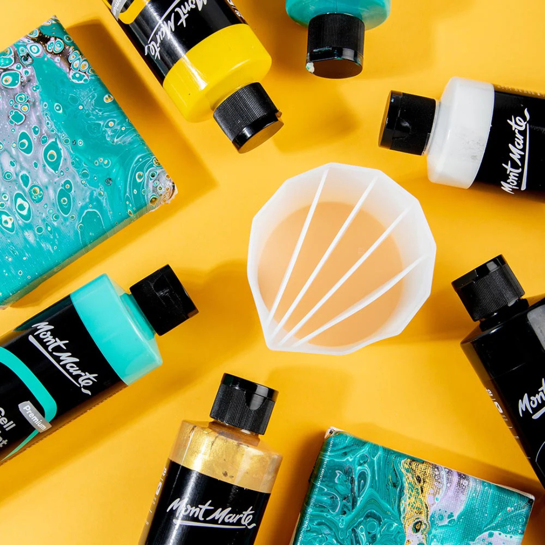 - This clever cup features a soft silicone design with five segments and a spout that’s comfortable to hold and helps you get precise pours. Getting started is easy, just pour your paint colours into each segment, then pour the cup onto a canvas to create your marbled masterpiece.