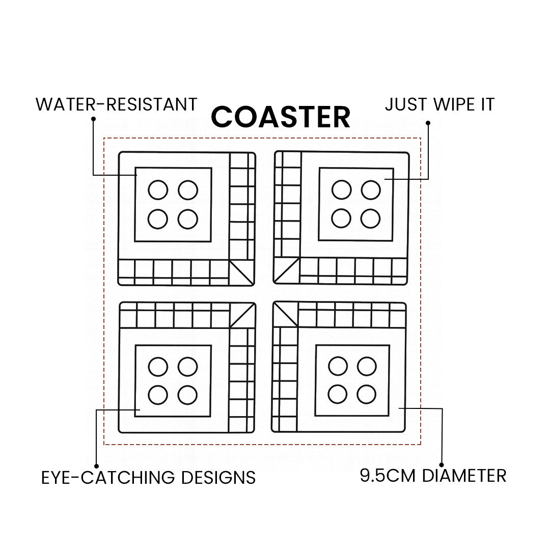 - Water Resistance: Spilled your drink? No problem! Our coasters are water-resistant so you don't have to worry. Just wipe it clean and you're good to go.