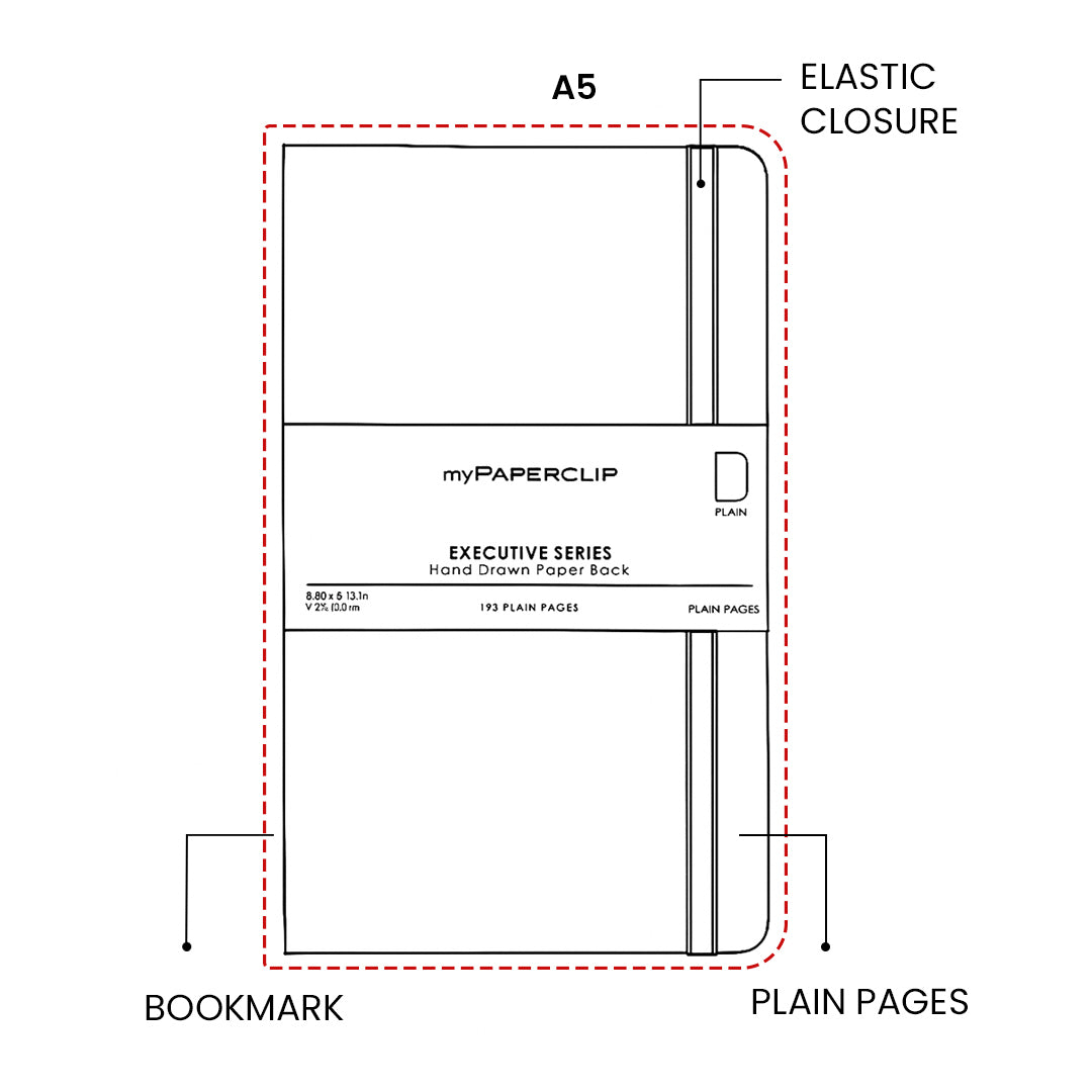 - Section thread bound, hand drawn cover for flat opening, rounded corners, a bookmark, an elastic closure & an expandable back pocket.