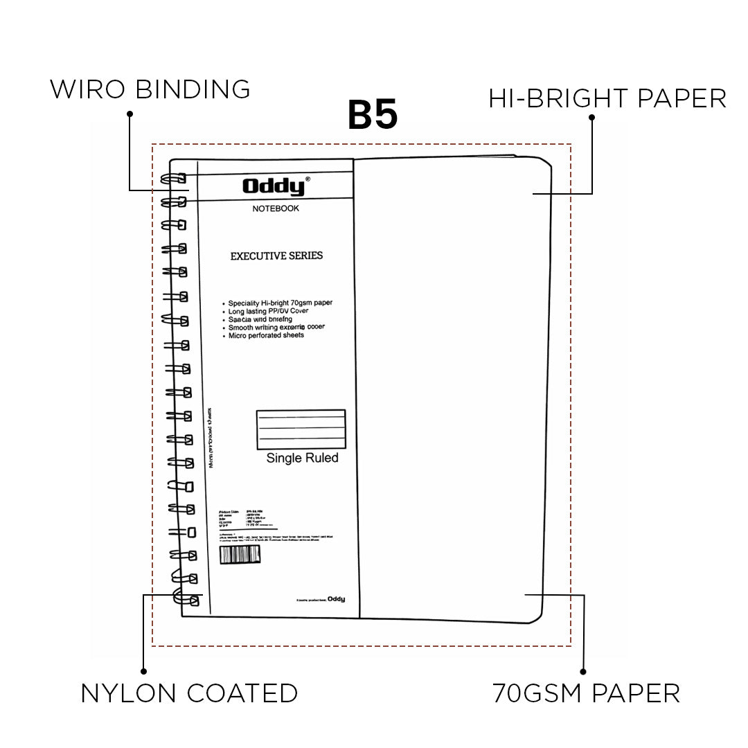 - The Oddy Executive Notebook is a premium B5-sized notebook with 160 white ruled pages made from 70 GSM specialty hi-bright paper, offering smooth writing and high opacity.