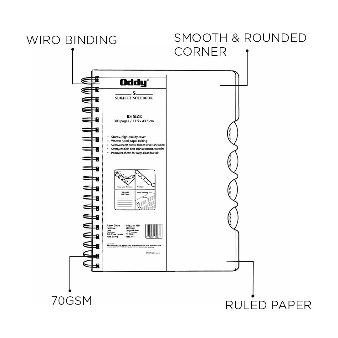 - The Oddy Five Subject Wiro Ruled Notebook is a premium notebook designed for organized note-taking across multiple subjects.