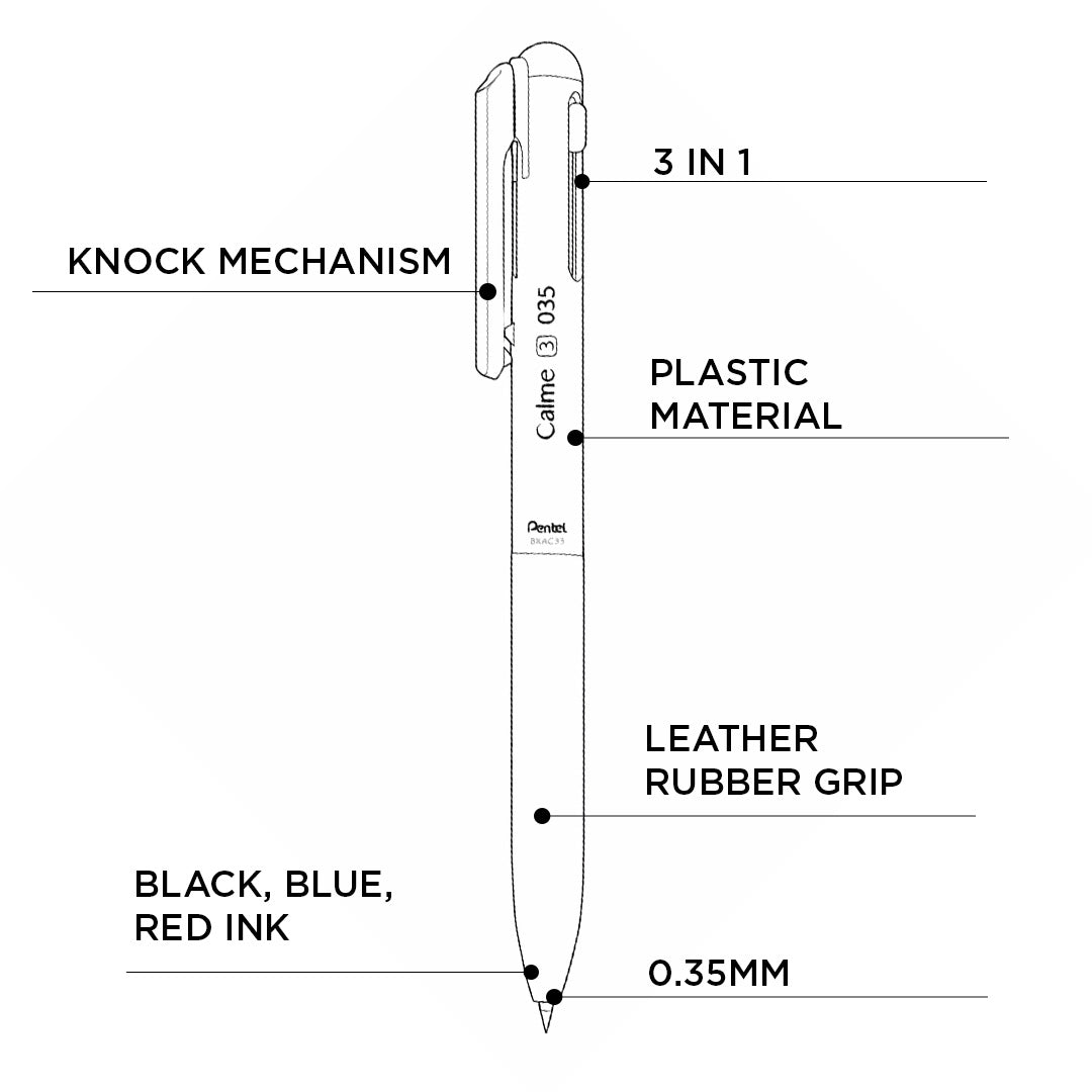 - With its clean design, reliable ink flow, and user-friendly multi-color functionality, the Pentel calme tricolor Ballpoint Pen is an excellent choice for students, professionals, and anyone who values comfort, convenience, and neat writing in a single pen.