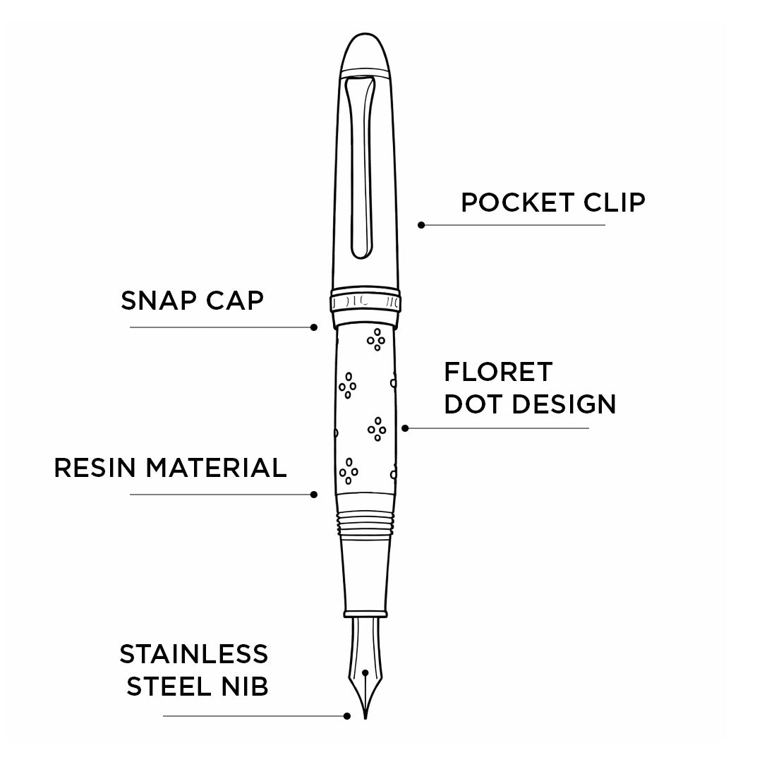 - Crafted with a premium resin body, this fountain pen features a stylish Floret Dot finish complemented by precious gold ion-plated trim, giving it a sophisticated and refined appearance.