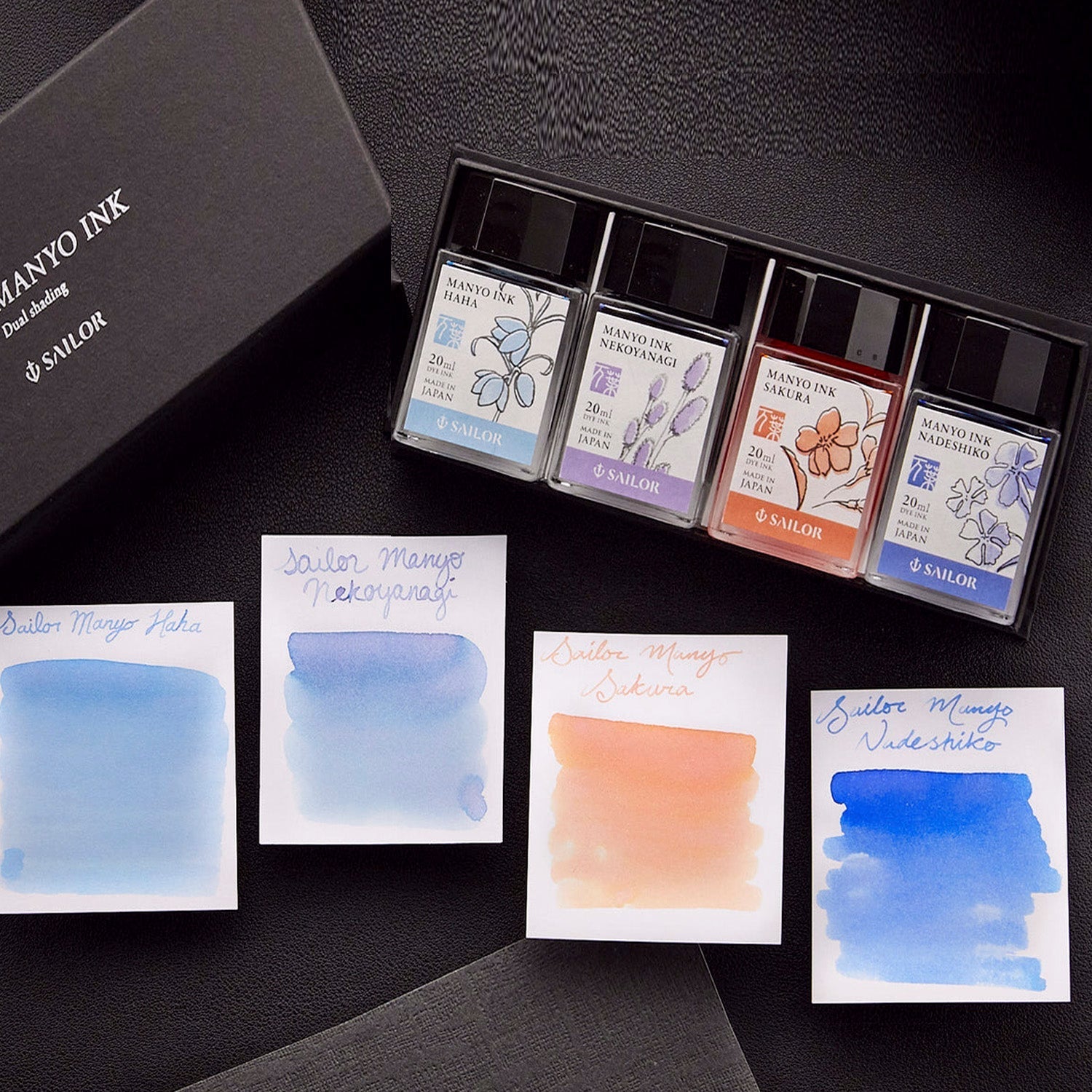 - The Manyo Dual-shading inks by Sailor are beloved for their variability, showing off surprising hues like pink within blue inks, purples within greens, and corals emerging from bright orange.