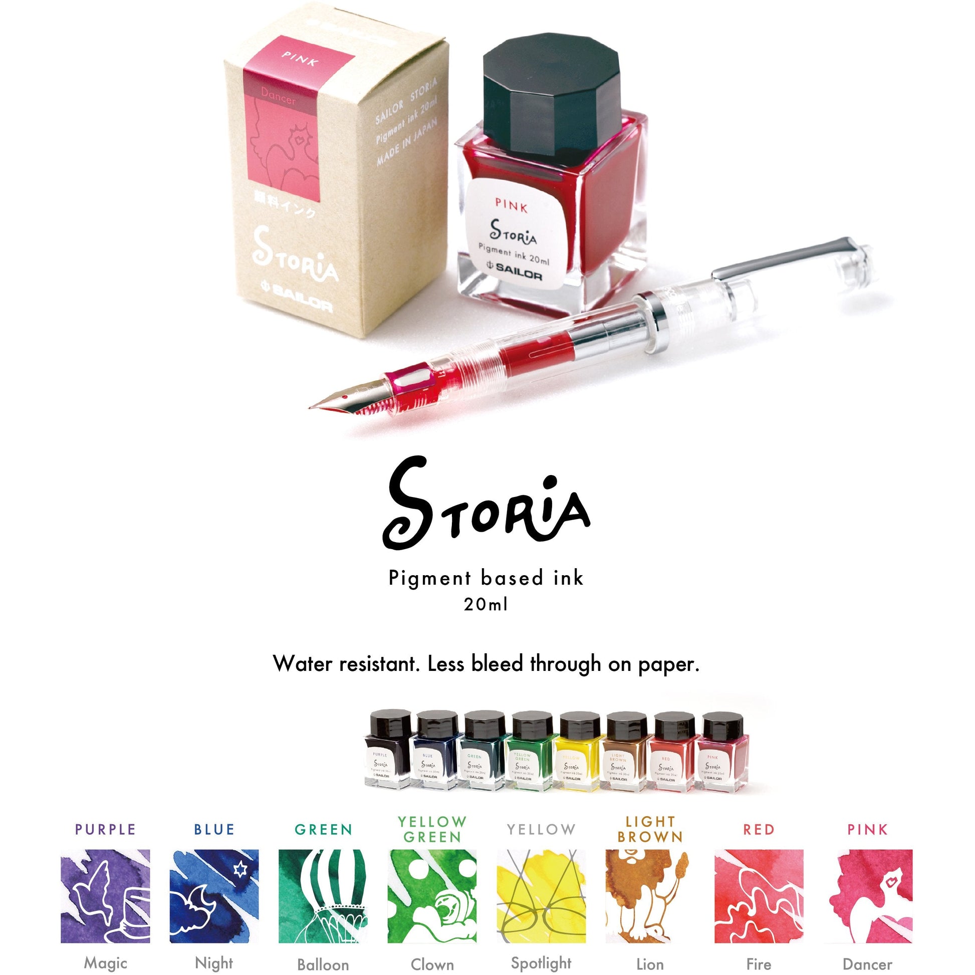 • Bring your writing and artwork to life with the vibrant, waterproof colors of the Sailor Storia Ink collection. Inspired by the world of performance and storytelling, each ink is named after elements of a circus—delivering bold expression and a sense of playfulness to every page.