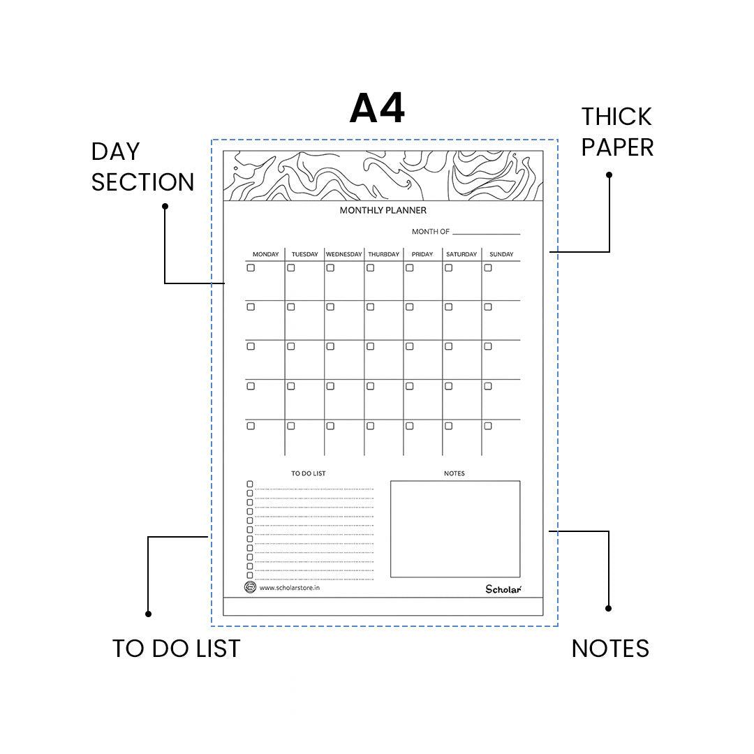 - The Scholar Monthly Planner Horizontal – A4 is designed to give you a clear overview of your entire month in one glance.