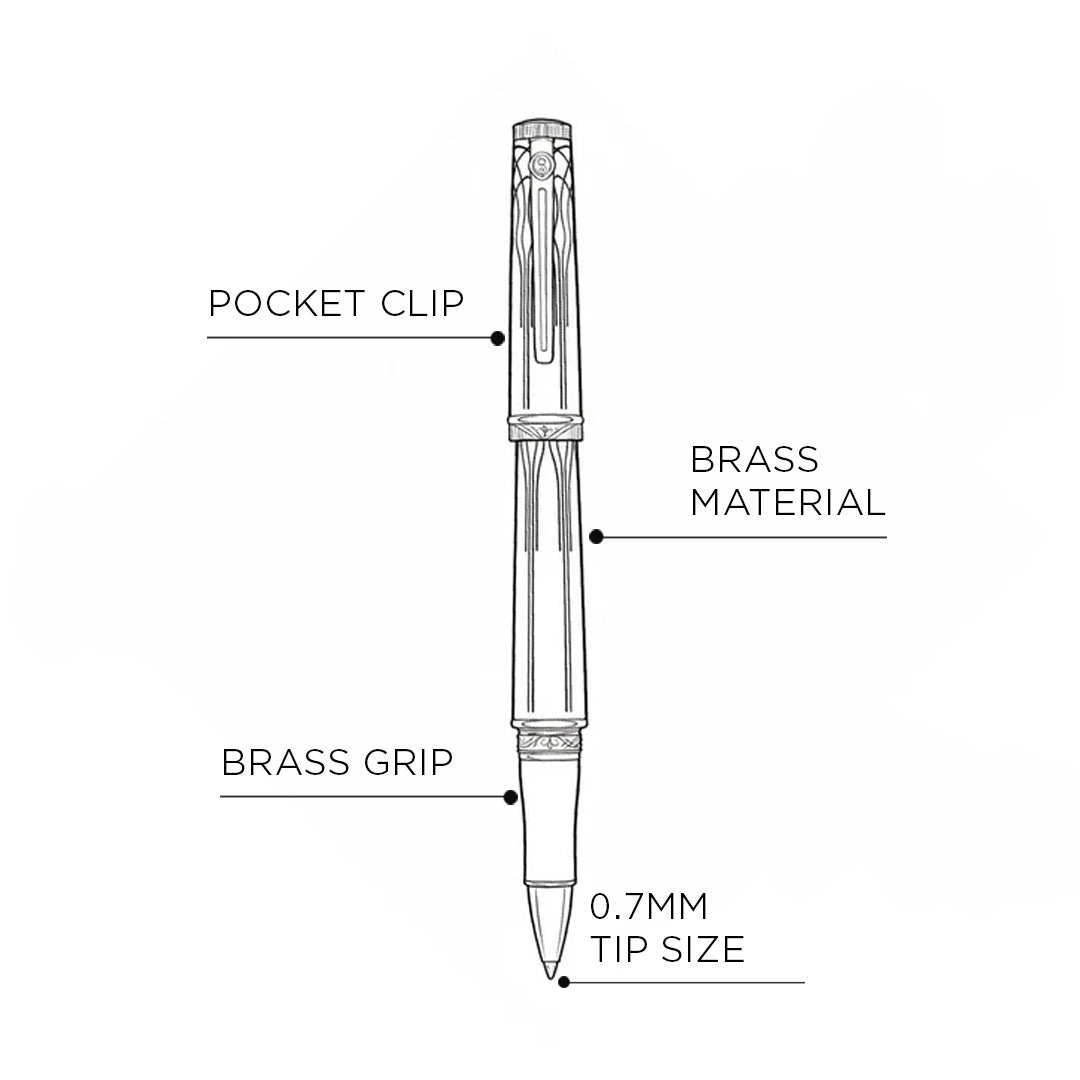 - Built with brass accessories for enhanced durability and a solid feel, this roller ball pen also includes a stainless steel spring clip plated with 23k gold at a heavy 1.2 µ thickness, ensuring both lasting shine and reliable performance.