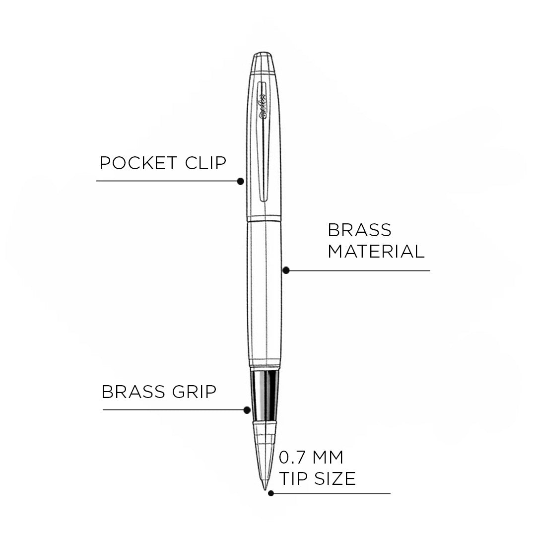- The pen is crafted with a solid brass body and brass grip, finished in elegant chrome for durability, balanced weight, and a comfortable hold.