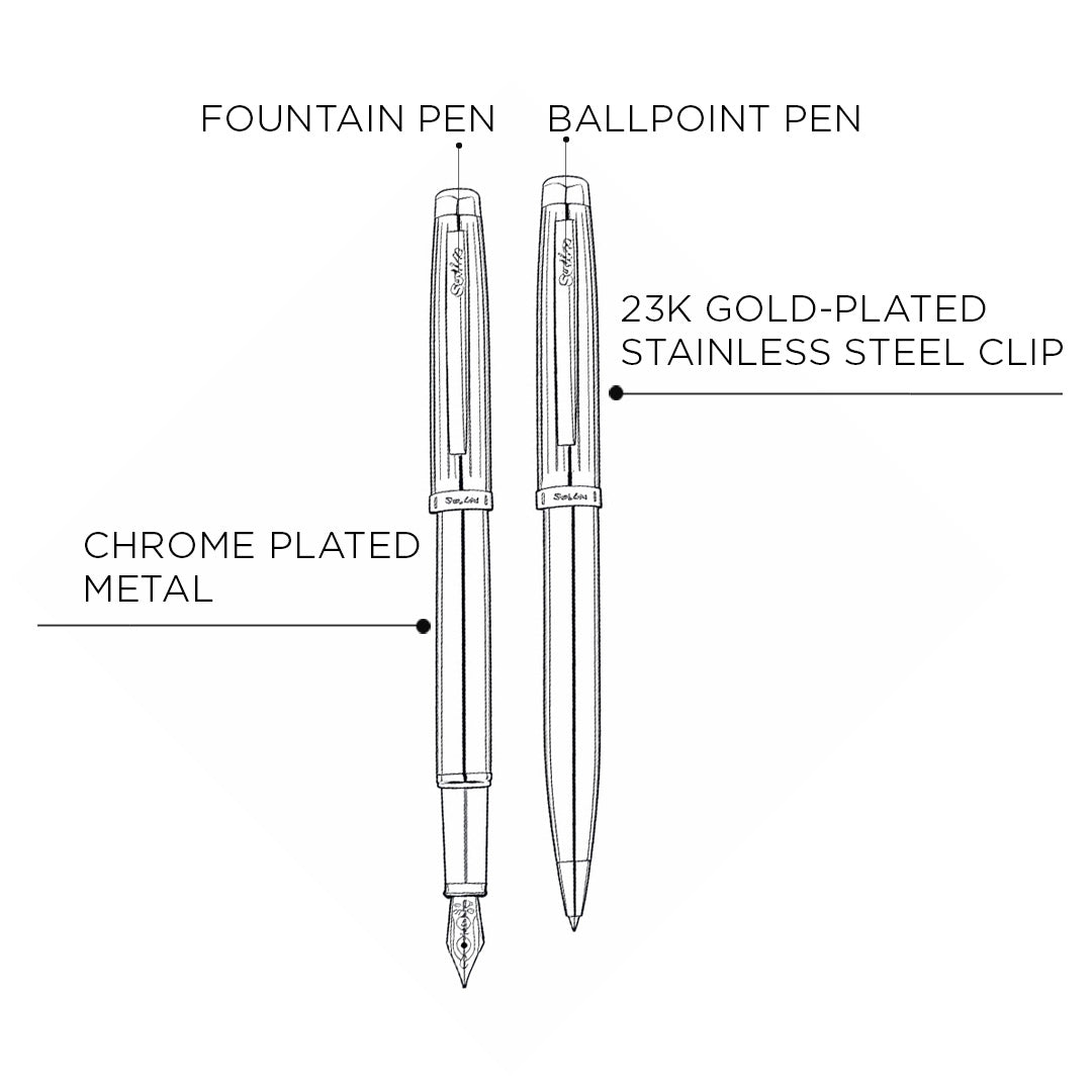 - The Scrikss Oscar 39 gold Chrome Fountain Pen and Ballpoint Pen Set is a refined writing ensemble that reflects elegance, craftsmanship, and timeless design.