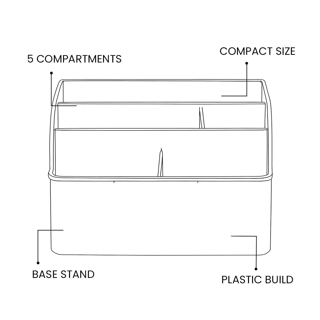 - Made from high-quality plastic, it features multiple compartments to hold pens, pencils, markers, scissors, sticky notes, clips, and other stationery essentials.