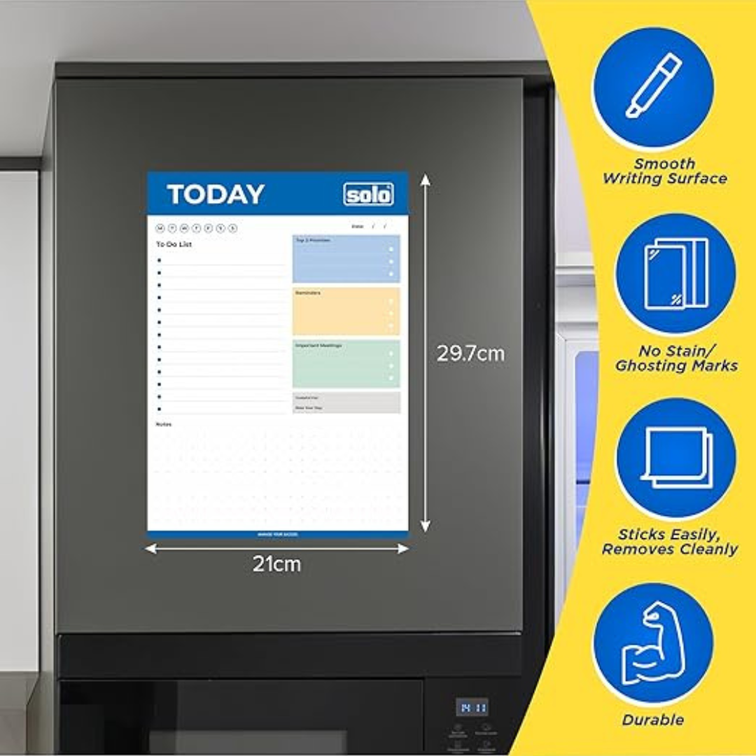 - COMPLETE MAGNETIC DAILY PLANNER SET: The SOLO FlexiBoard A4 Magnetic Daily Planner whiteboard set includes everything you need, it comes up with an A4 (29.7x21 cm) whiteboard surface, 2 magnetic markers, 1 magnetic duster, and 4 ferrous sheets. This smooth writing surface allows you to effortlessly capture your thoughts and also providing the perfect platform for planning. The fine-tip markers with magnetic caps ensure smooth writing and easy erasure without leaving any residues behind.