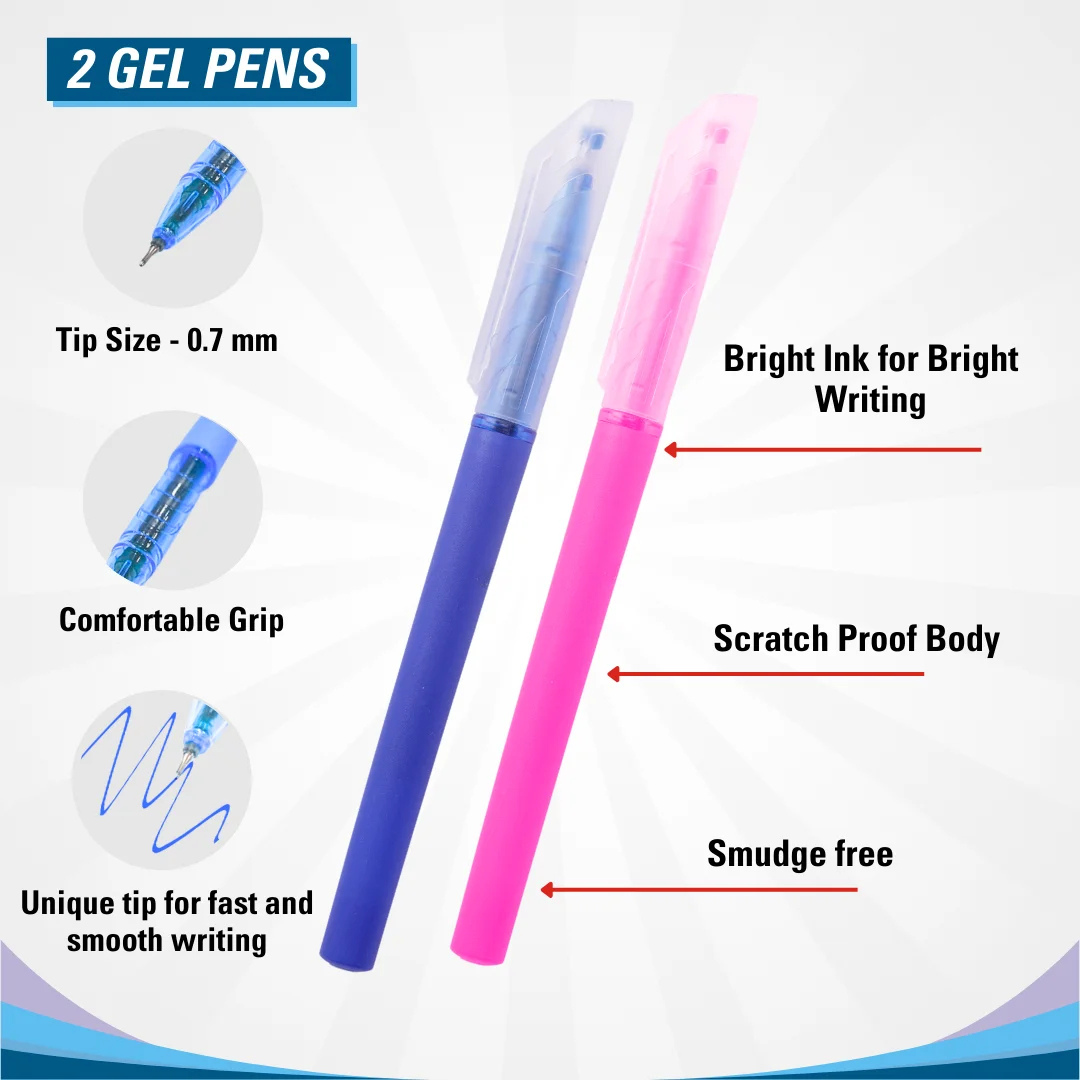 - 2 Gel Pens: Tip size of 0.7 mm with a comfortable grip, designed for fast and smooth writing. Features smudge-free, bright ink and a scratch-proof body.