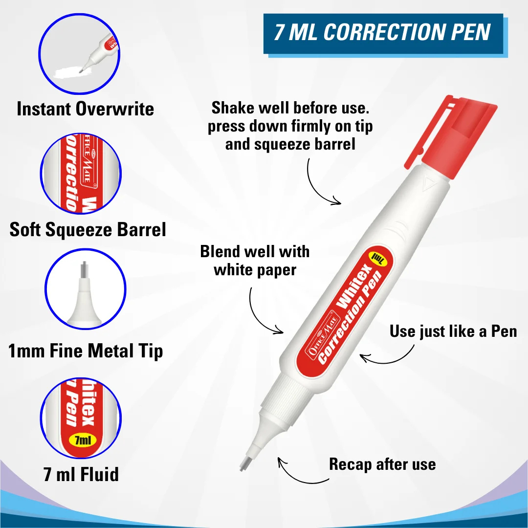 - Correction Pen (7 ml): Soft squeeze barrel with instant overwrite capability, featuring a 1 mm fine metal tip for precise corrections.