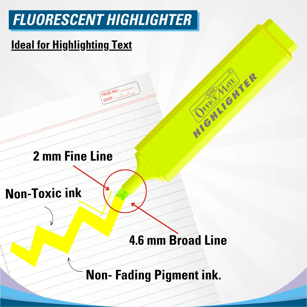 - Fluorescent Highlighter: Ideal for highlighting text with non-toxic, non-fading pigment ink, featuring dual tips with a 4.6 mm broad line and 2 mm fine line for versatile use.