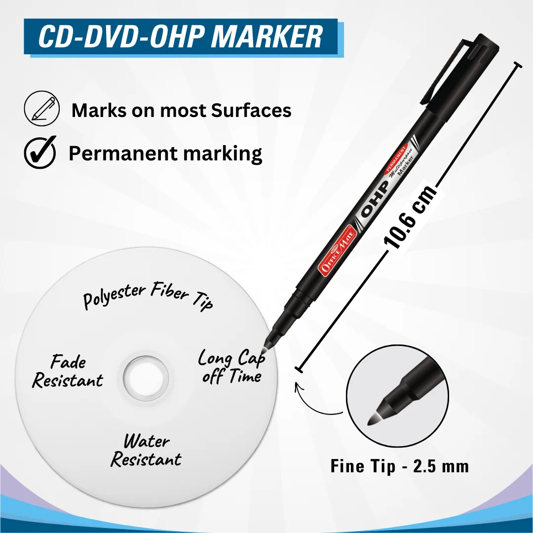 - CD/DVD/OHP Marker: Marks on most surfaces with permanent, fade-resistant, and water-resistant ink. Features a fine 2.5 mm polyester fibre tip, long cap-off time, and measures 10.6 cm.