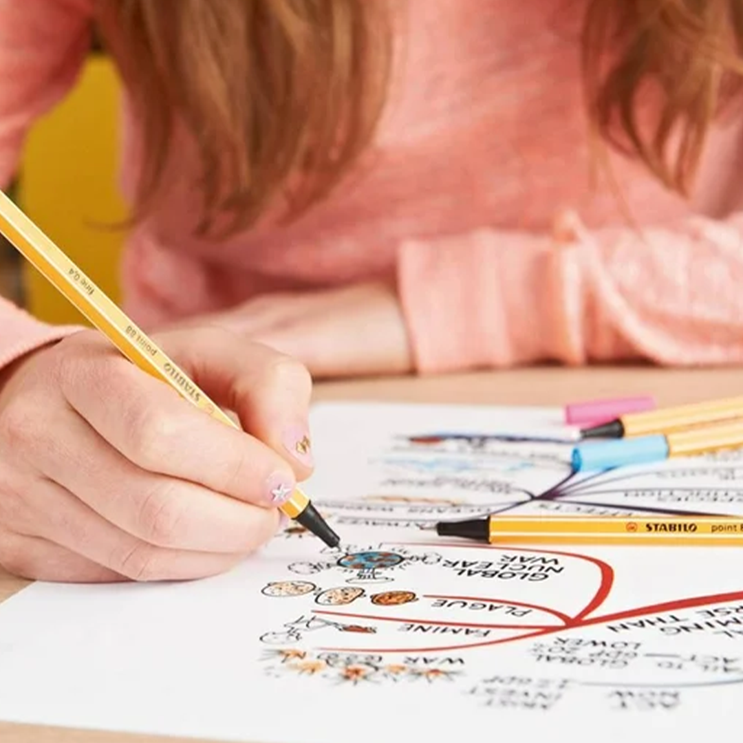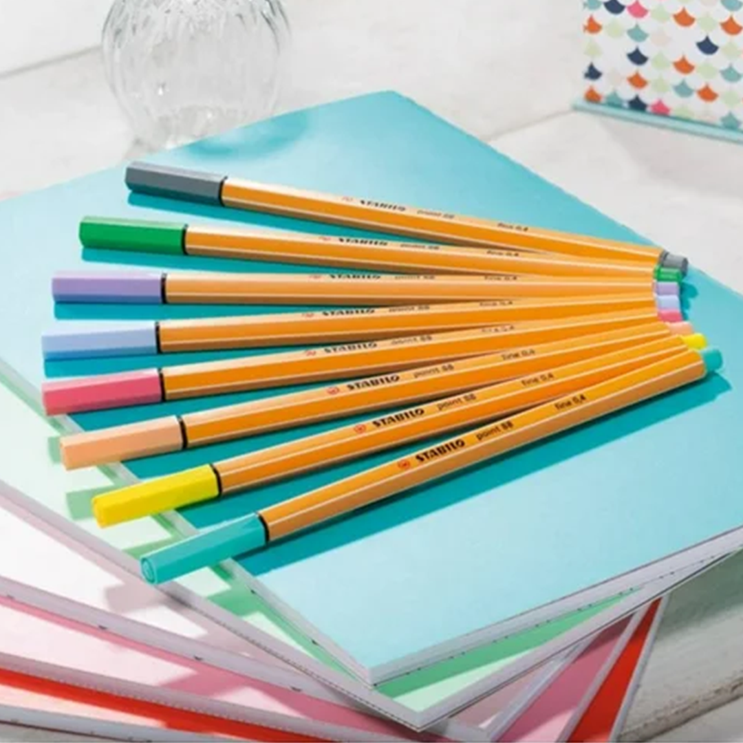 - This 24 piece creative set contains 12 pastel shades of the point 88 fineliners and 12 the same colors of the Pen 68 felt-tip pens: 11 ice blue, 12 eucalyptus, 14 hint of lime, 23 light yellow. 25 pastel orange, 26 apricot, 28 blush, 34 pistachio, 62 greyish violet, 67 mustard, 88 light ocher and 93 warm grey.