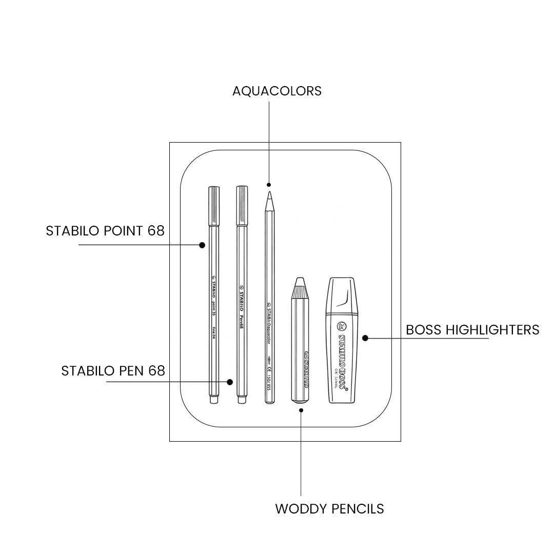 - This premium set includes a versatile mix of Stabilo’s most loved pastel tools—featuring colour pencils, fineliners, fibre-tip pens, and highlighters—carefully curated to inspire creativity across sketching, colouring, lettering, and journaling.