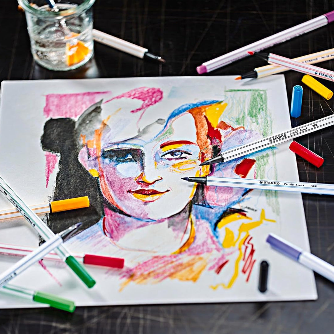 - STABILO Pen 68 Brush ARTY Felt Pen Cardboard Case, 10 pcs. By changing the pressure on the nib, you can use the nib to create thick or thin lines.