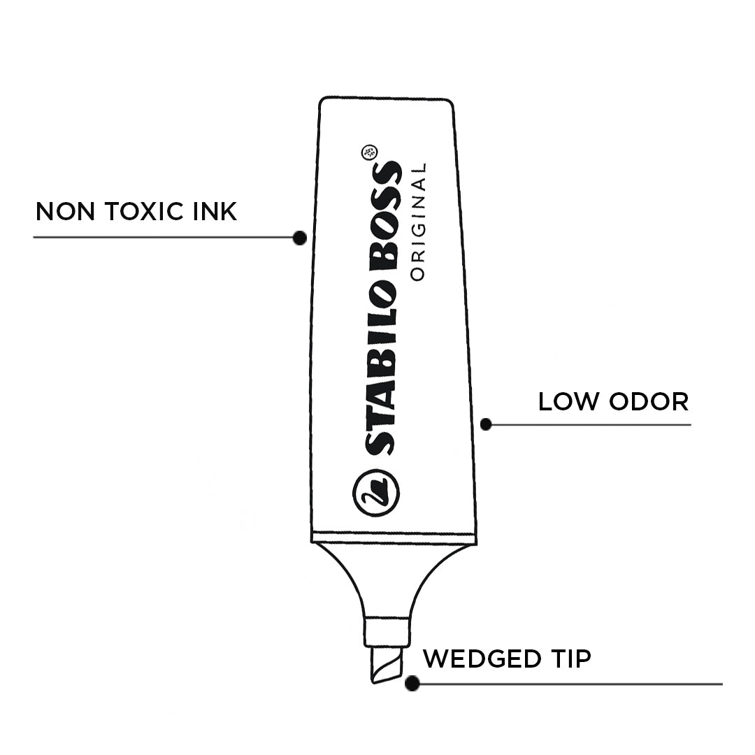 - The fluorescent ink is water-based and therefore completely harmless to health. These features make the Stabilo Boss Original a perfect highlighter that can rely on.
