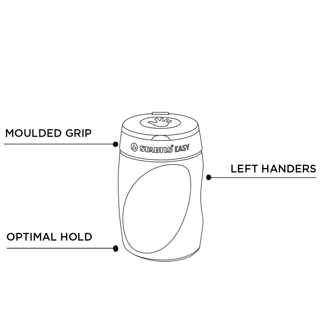 - The Stabilo EASY Left-Handed Sharpener is specially designed to offer maximum comfort, control, and precision for left-handed users.