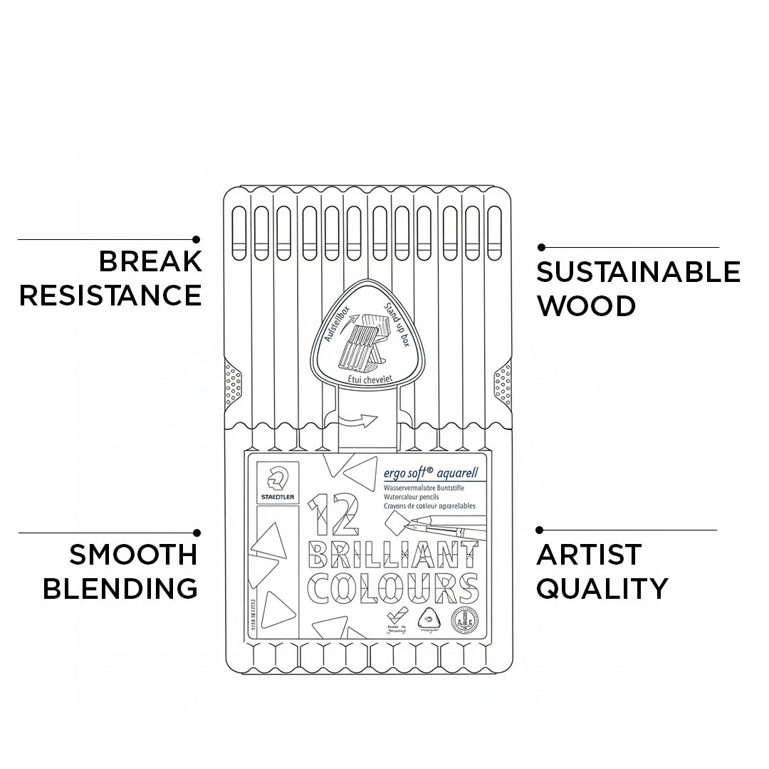 - Staedtler ergosoft aquarell watercolour pencils are crafted from high-quality wood and designed with a soft, ergonomic surface that offers a comfortable, slip-free grip during long colouring sessions.