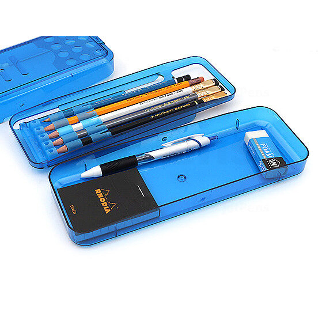 - Removable top tray with five pencil slots, each of which can lift up for easy access, and additional compartments for an eraser and other items.